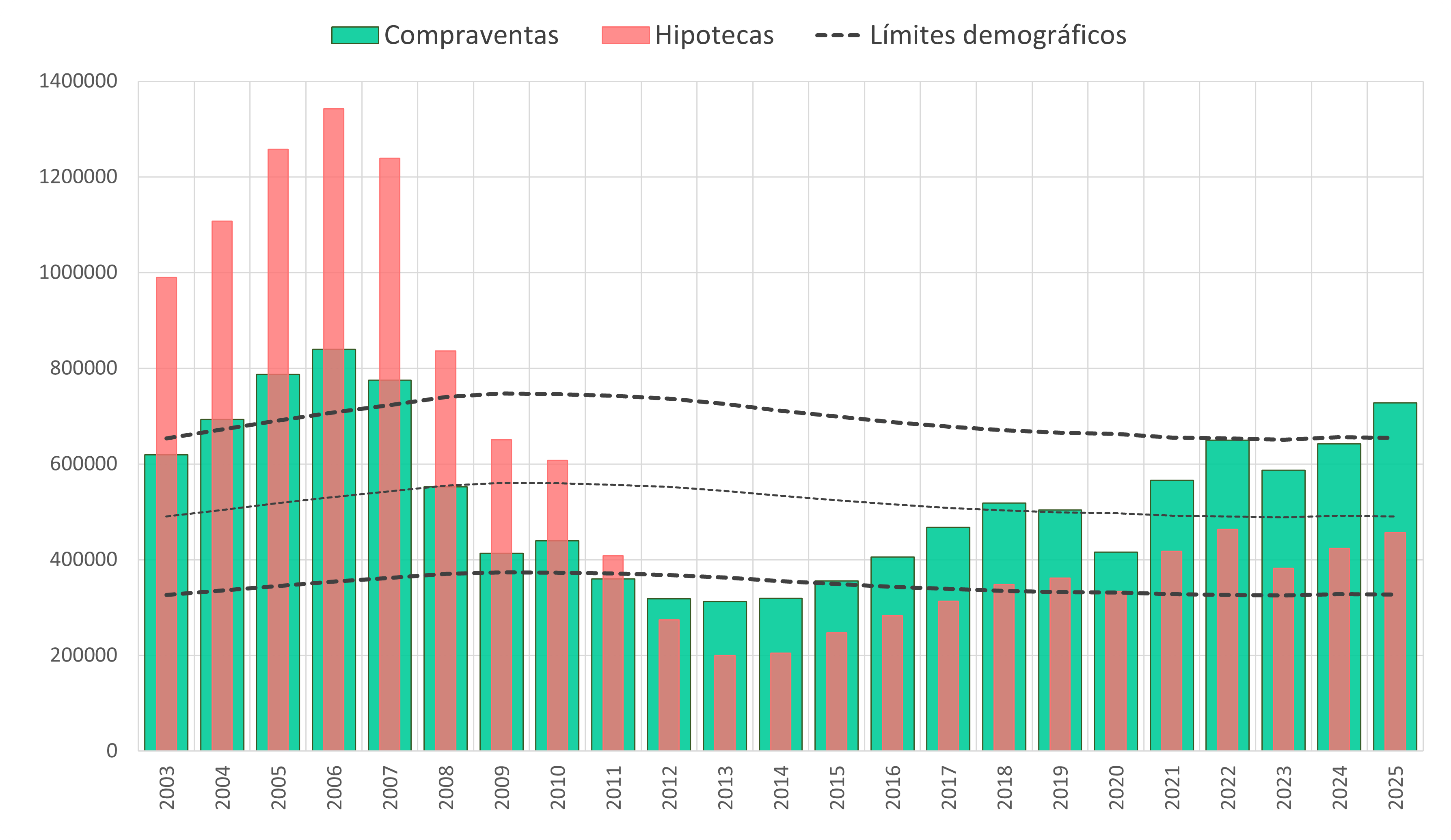 La compraventa de viviendas se dispara en 2025, con más compraventas de las que se deberían esperar por demografía, sin embargo las hipotecas siguen en una zona razonable.