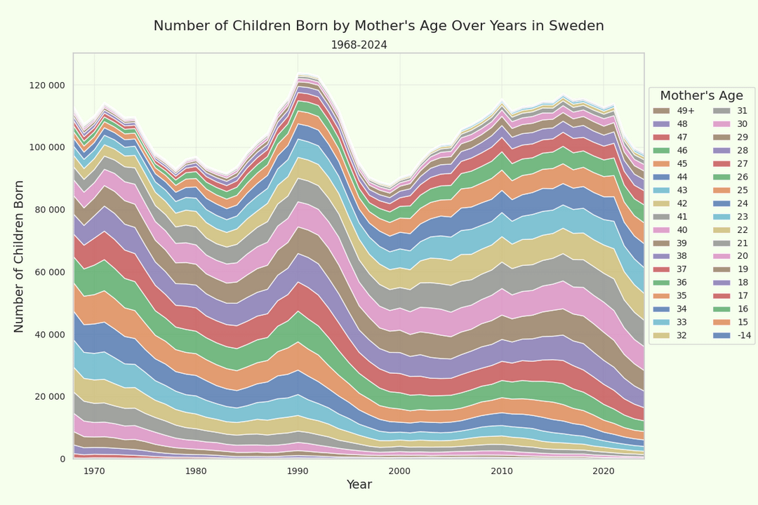 In 1968 75% of newborns had a mother under the age of 30 and 25% was born by mothers at least 30 years old. In 2024 the numbers was almost completely reversed as 29% of newborns had a mother under the age of 30, while 71% was born by mothers aged 30 or older. The biggest change for among the age groups was in the decline in the group of mothers 20-24 which went from giving birth to 34% of all children 1968 to 6% 2024 and for the group of mothers 30-34 who went from giving birth to 16% to 41% of all children.