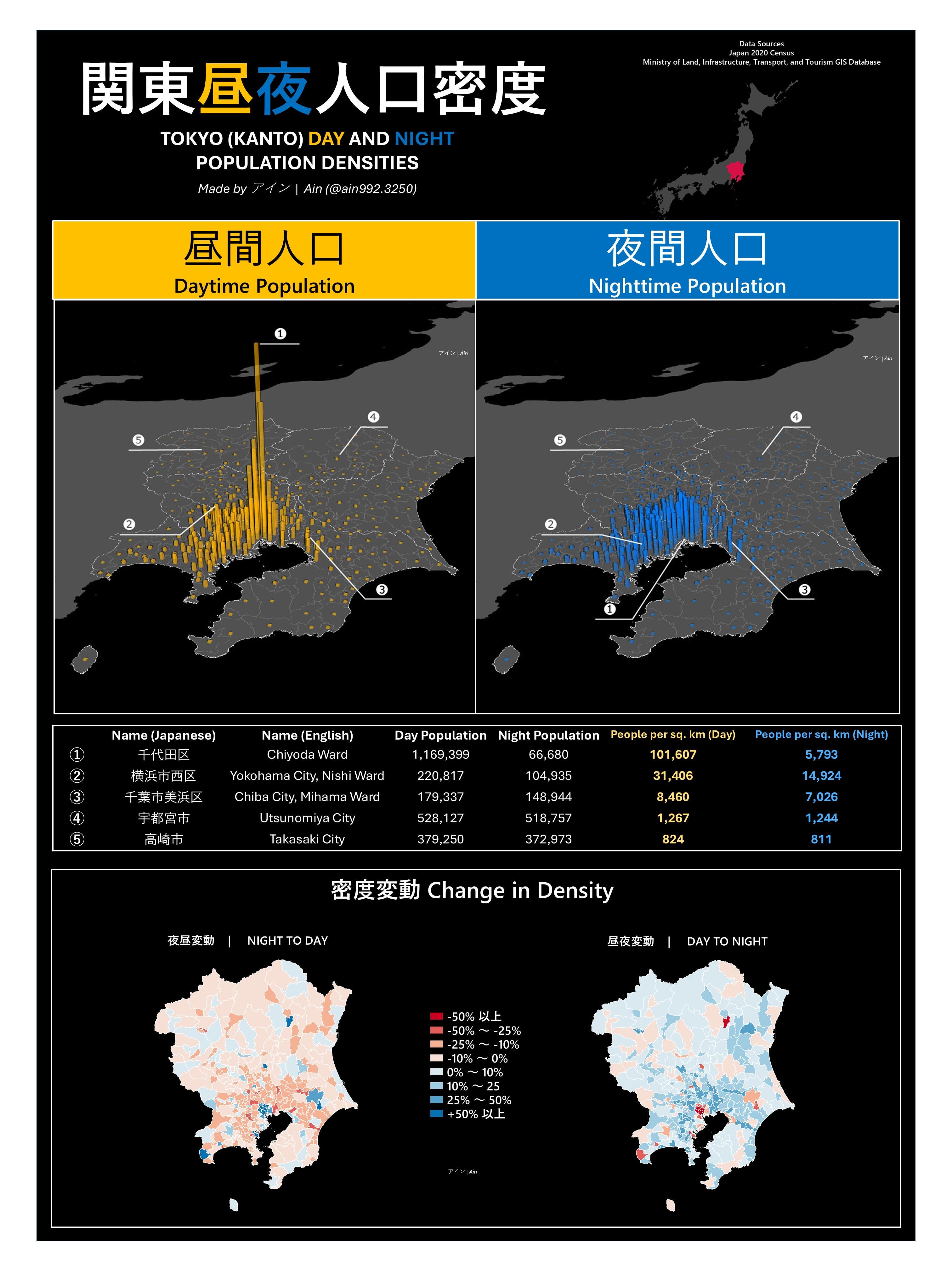 Made for a school project with QGIS, redesigned in a style I prefer. 3D Visualization features census data down to the municipality/ward levels, with each “box” extruded to each place’s density in the day and night. Sources: Japan 2020 Census & Ministry of Land, Infrastructure, Transport, and Tourism GIS Database