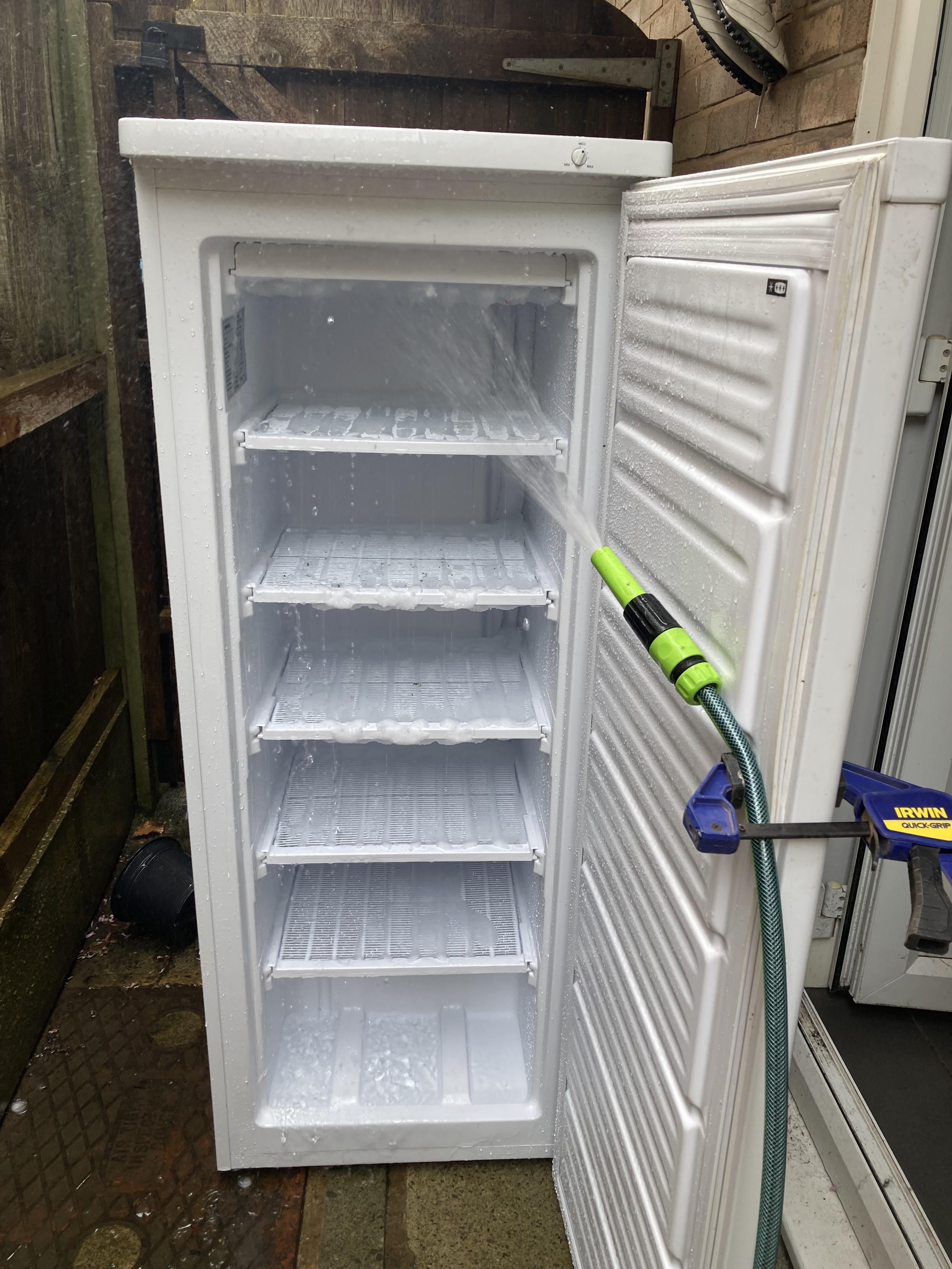 I don’t have a garden so I just waddle my freezer into the shower and do it there. There is something unsettling about seeing old peas and fishfinger breadcrumbs floating around in the tray!