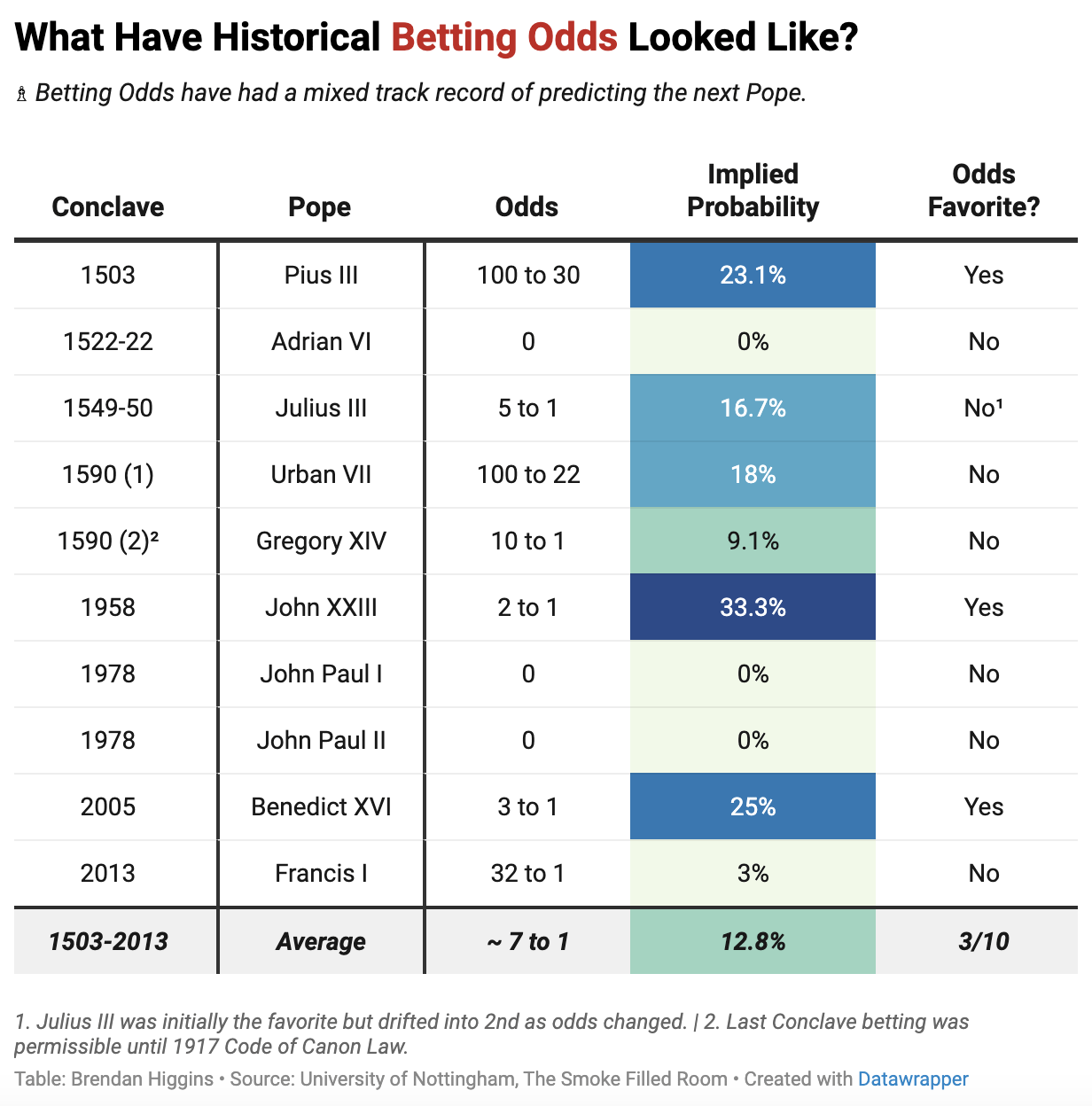 Historical betting odds for Papal Conclaves (based on all available historical data). https://smokefilledroom.substack.com/p/who-will-be-the-next-pope