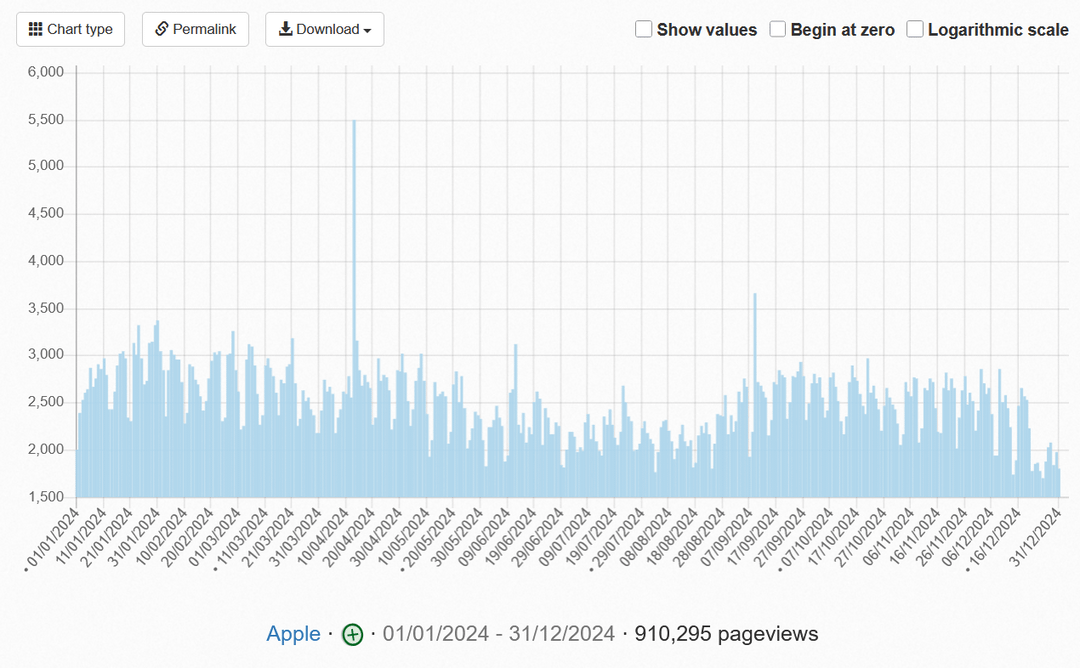 1) How could they know that the “Apple” views are for the fruit and not the company? Doesn’t it seem more likely that most of the Apple (fruit) view are often mistakes by people looking to view Apple (tech company)?