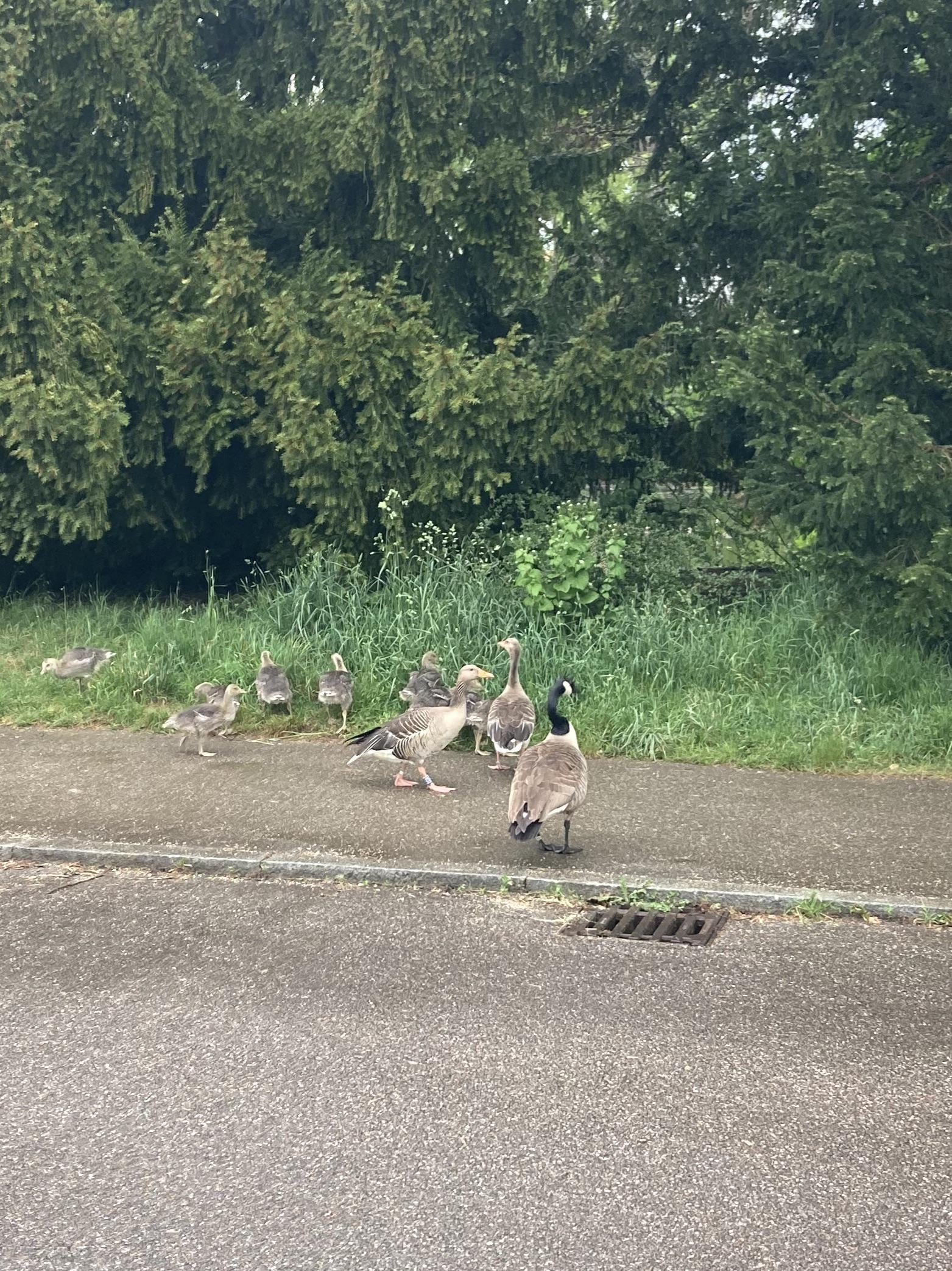 Teilweise chillen die Nilgänse auch woanders und die Zuchtgänse passen solange auf den Nachwuchs der Nilgänse auf. Das geht sogar soweit, dass die Zuchtgänse alleine mit den Nilgansjungen schwimmen gehen, mit ihnen kuscheln und sie unter ihre Flügel nehmen, während die Nilganseltern irgendwo grasen. Der Ganter und das Weibchen der Zuchtgänse reagieren sogar viel aggressiver auf etwaige Gefahren und Eindringlinge als die eigentlichen Eltern. Das Hausgansmännchen lässt keinen auch nur in die Nähe der Küken, während die Nilganseltern total gechillt sind und es dulden, dass Menschen bis auf 1m ran kommen und Fotos machen. Das fand ich sehr faszinierend.