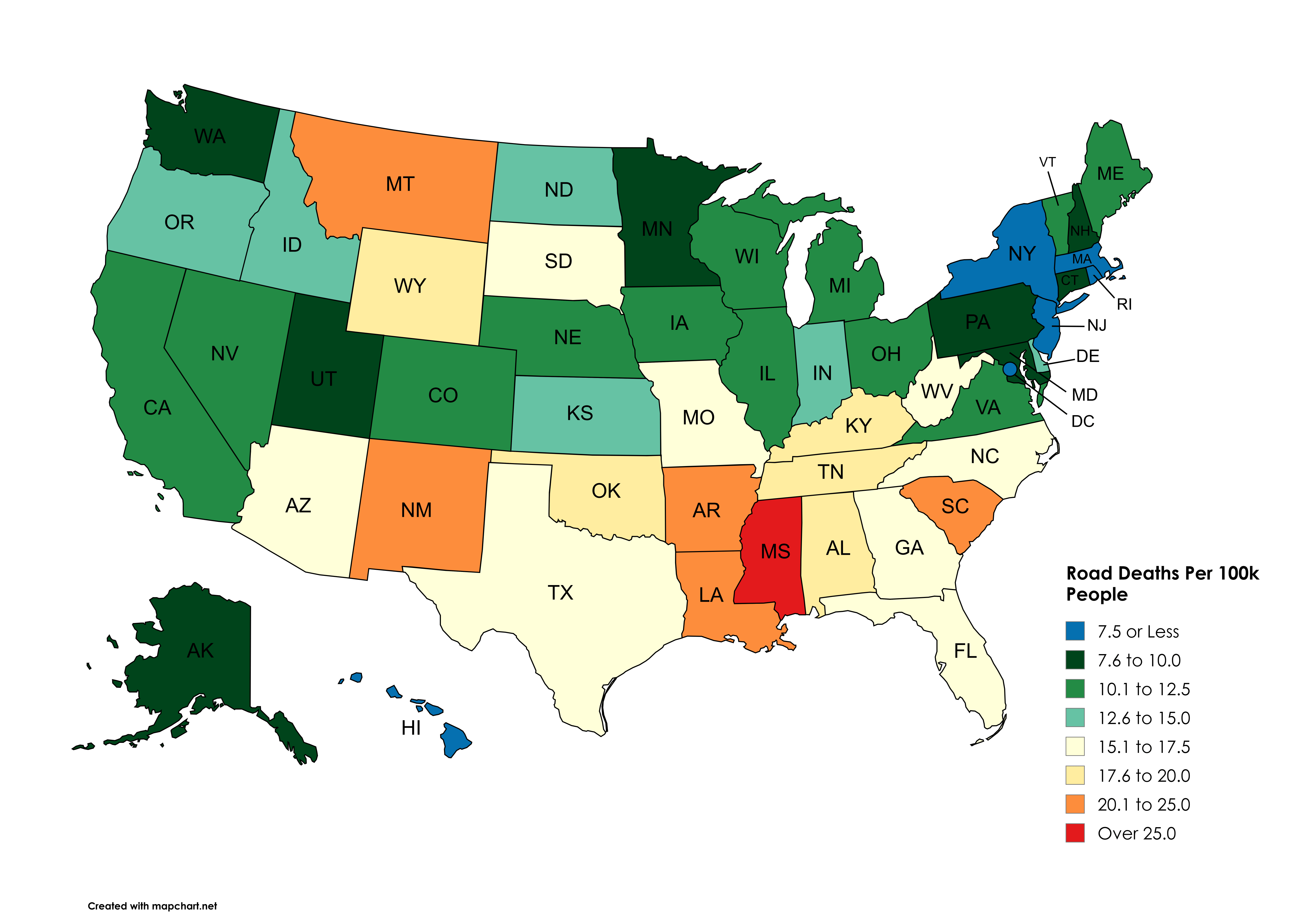 [OC] Road Deaths Per 100k People by U.S. State (2021 Data From NHTSA)