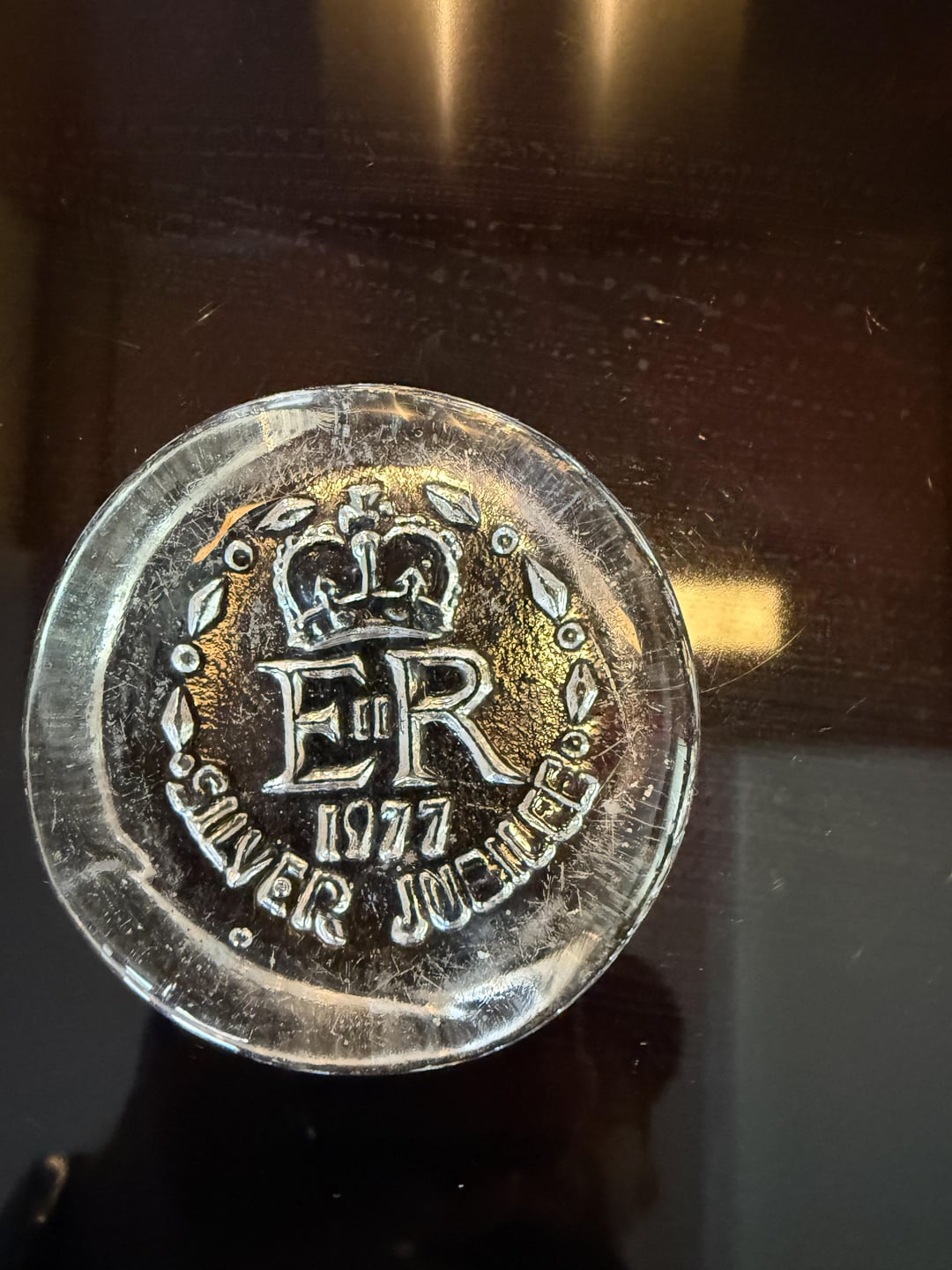 It’s a glass paperweight from 1977 Jubilee. Worth about £8.