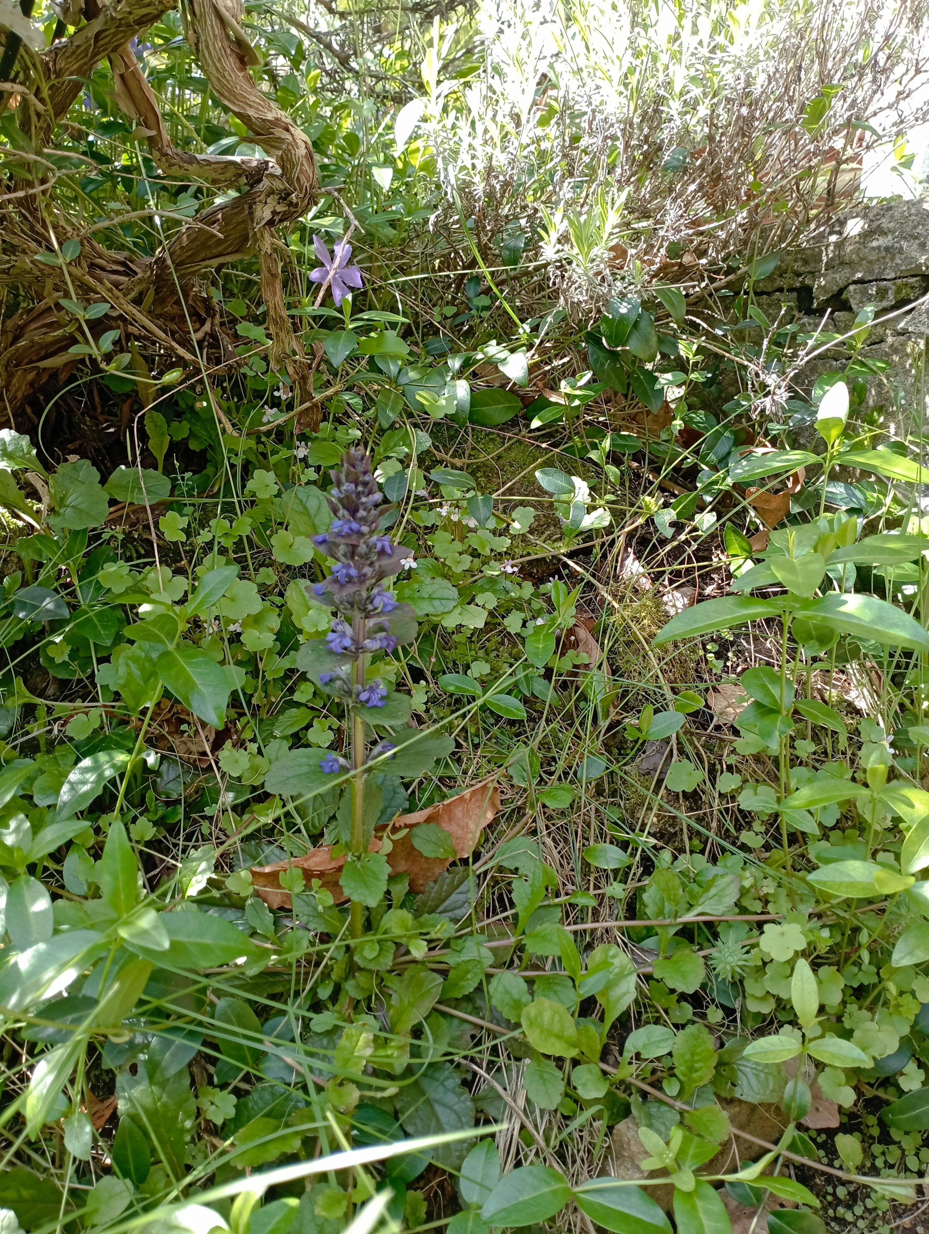 Kriechender Günsel, im Hintergrund Mauer-Zimbelkraut