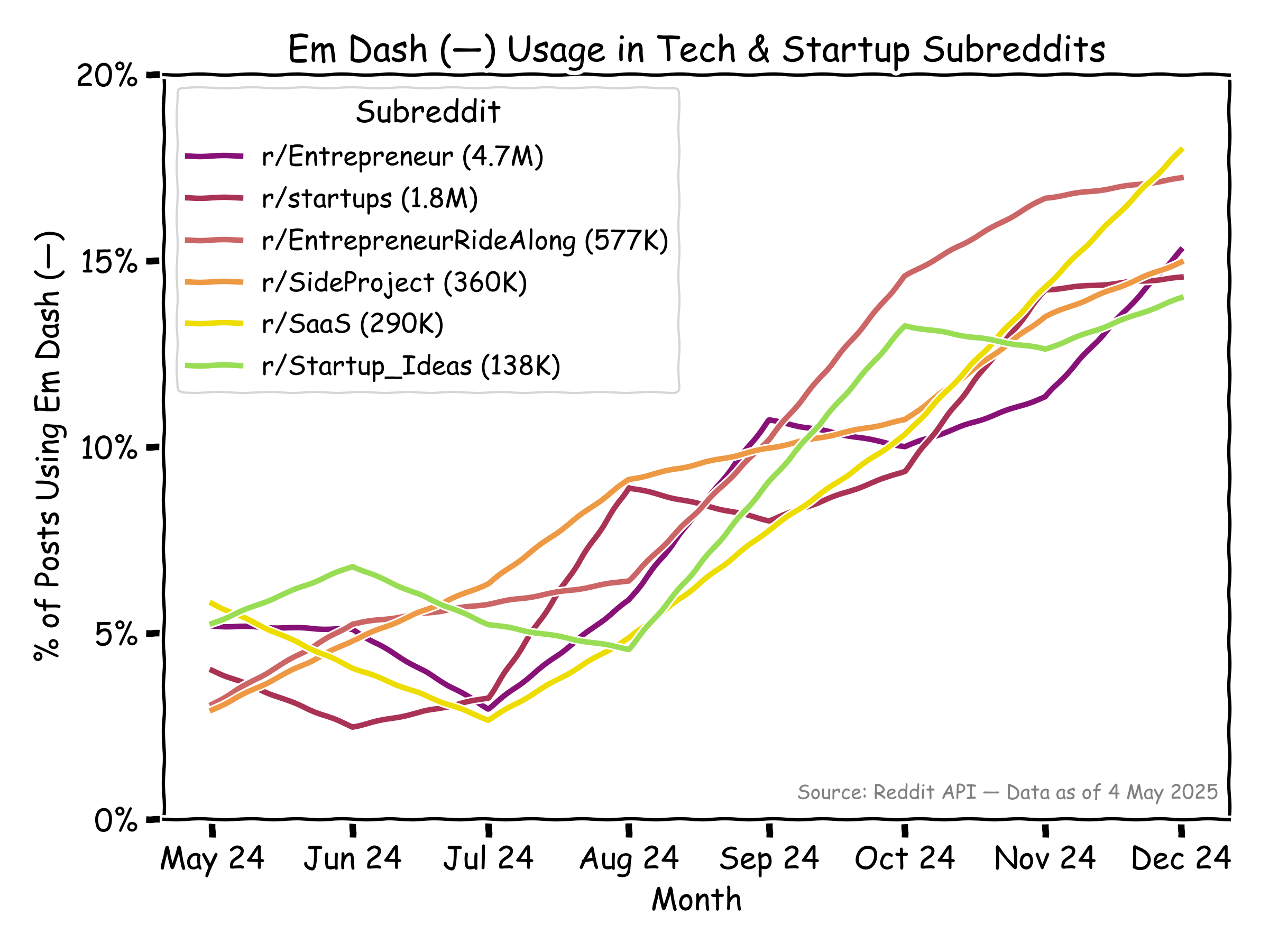 [OC] Em Dash Usage is Surging in Tech & Startup Subreddits