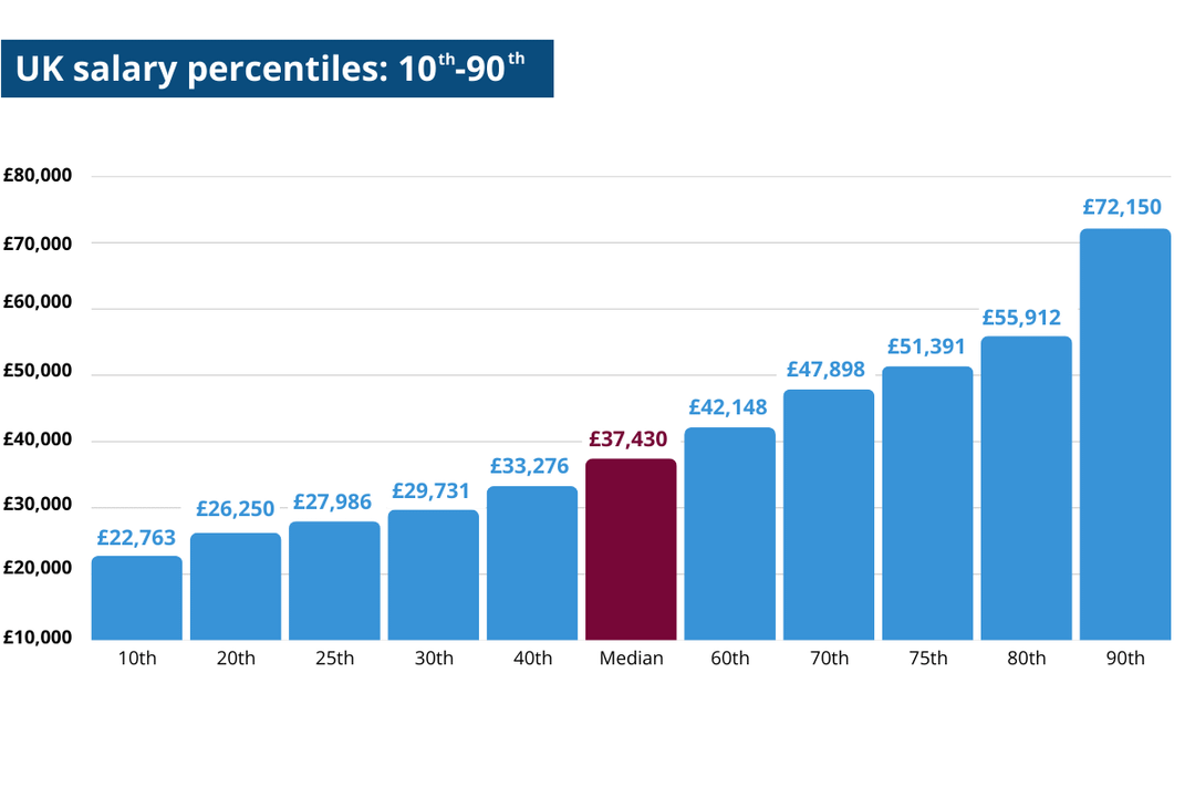 - 80% of people in the UK earn between £22,763 and £72,150 (10th and 90th percentile)
