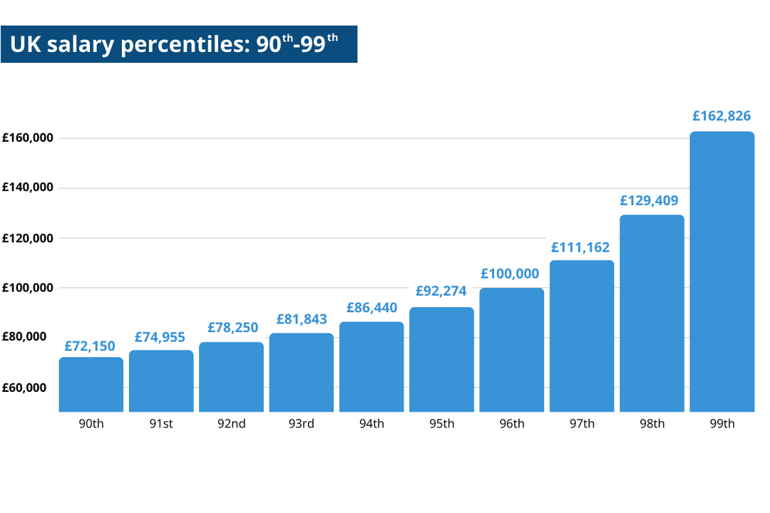 - The difference between the 10th and 20th percentile is £3,487. The difference between the 90th and 99th percentile is £90,676.