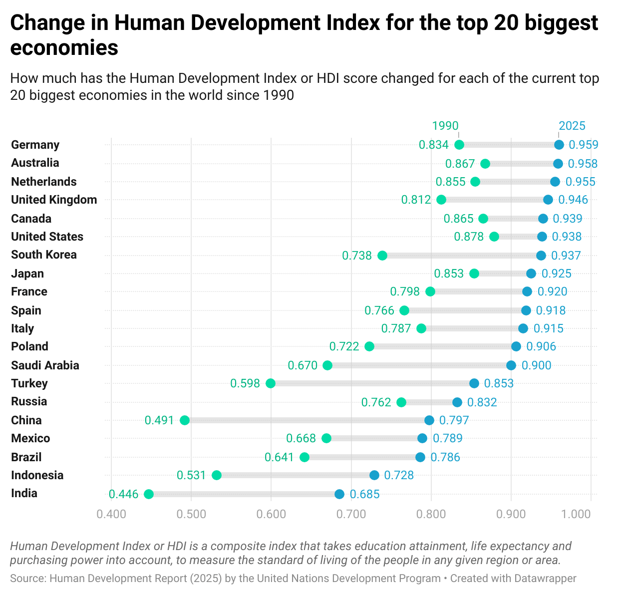 [OC] Change in Human Development Index for the top 20 biggest economies Posted by _crazyboyhere_ Tags:DataData Is BeautifulDataIsBeautiful 7 comments Source: [Human Development Report 2025](https://hdr.undp.org/system/files/documents/global-report-document/hdr2025reporten.pdf) Tools: [Datawrapper](https://www.datawrapper.de/) The United States went from #1 to #6 and had the lowest total improvement of any of the 20 countries listed. Sounds about right. But we Germans still love to complain about our situation How did the Germans lose 2 wars and still come out on top. Shit needs to be studied lol India is where Poland was in 1990? Makes sense I would love to see the united states broken down by state Russia being on the same level as Spain in 1990 seems sus Comments are closed.