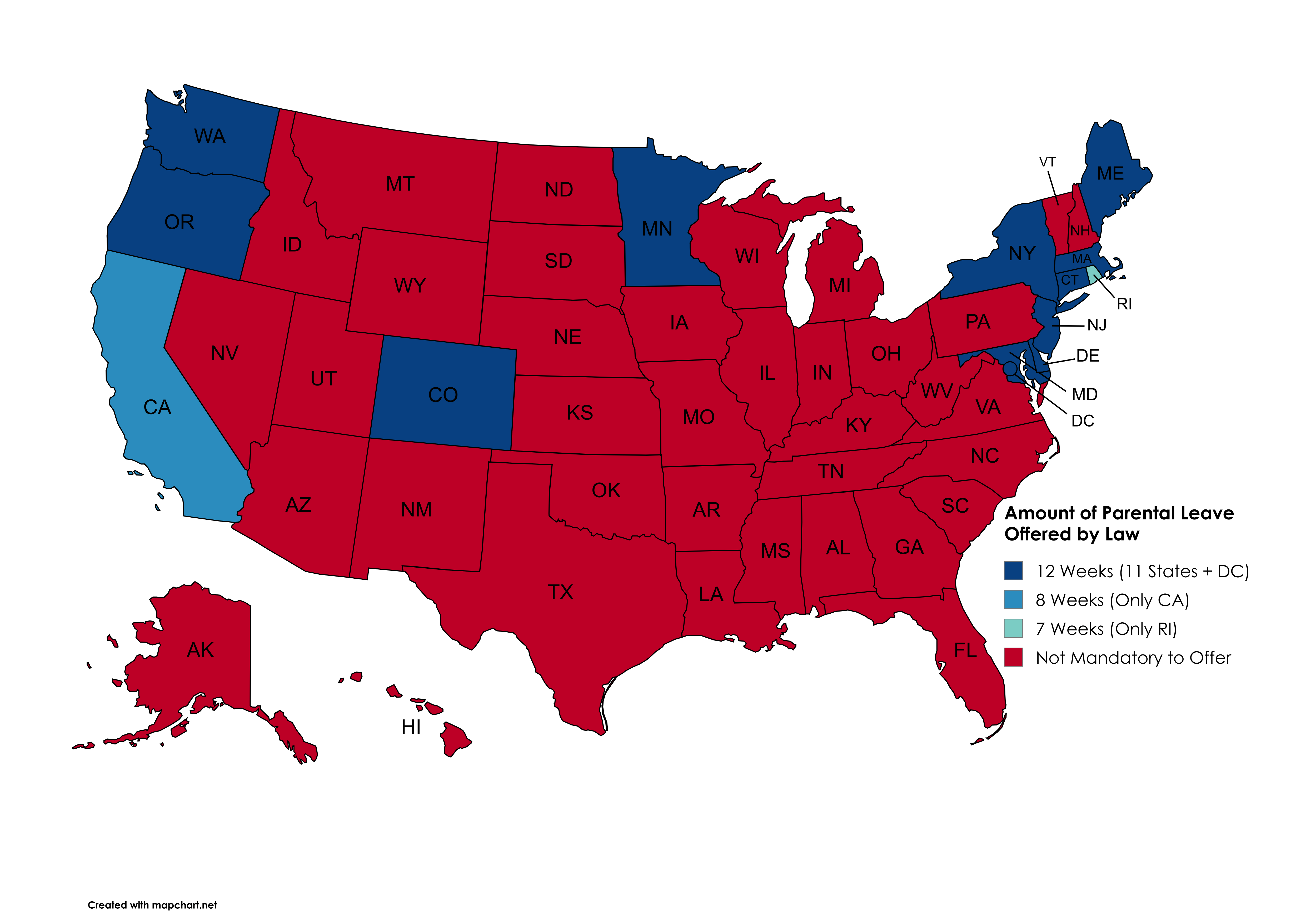 - California was the first state to introduce mandatory parental leave (law became effective in 2004). New Jersey was second in 2009.