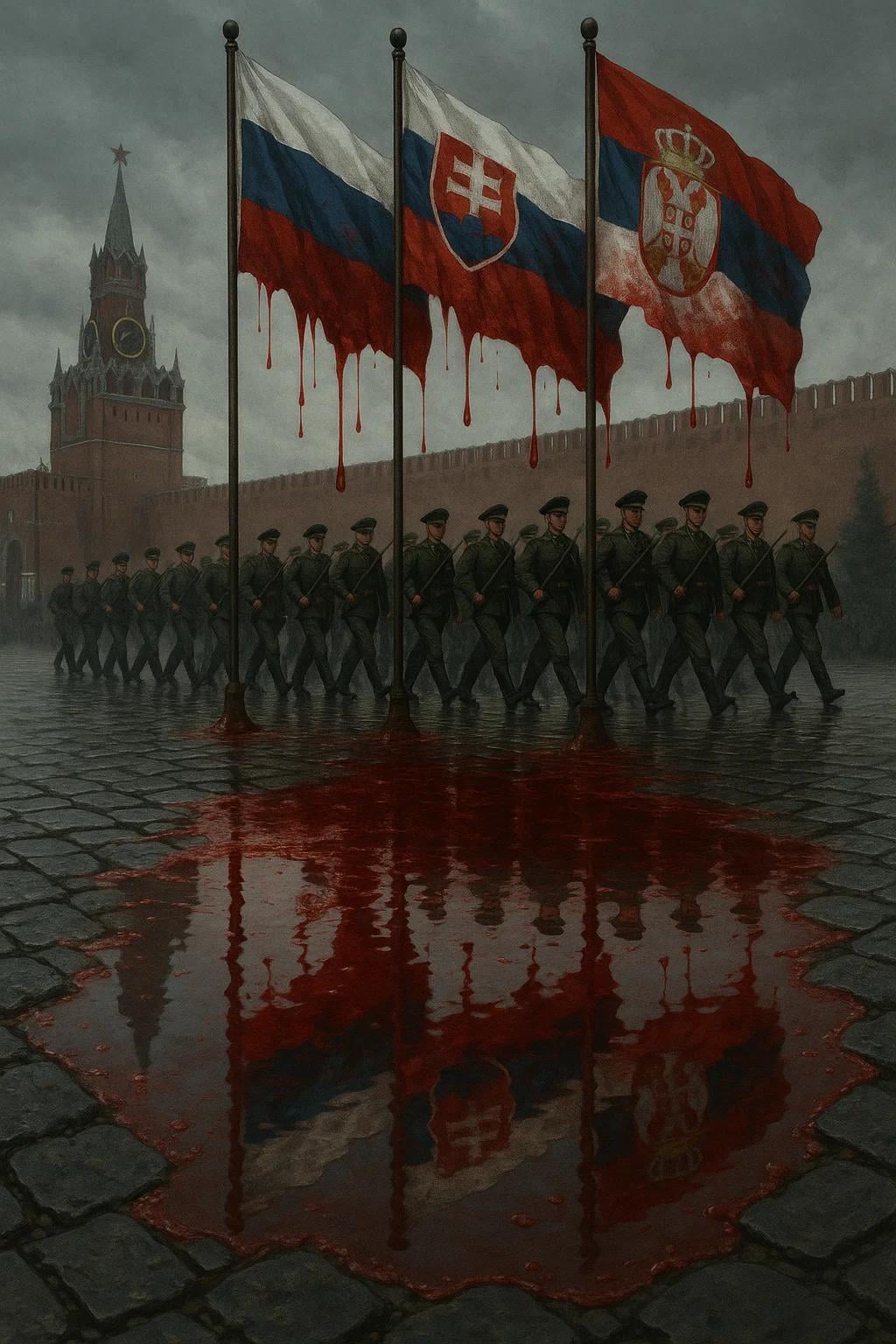 At Moscow’s parade, Slovak and Serbian flags wave beside Russia’s—drenched in ceremony, deaf to screams of killed civilians from Bucha, Irpin and Izium. At the same time, Russians bomb Ukrainian cities, civilians, children. It’s truly grotesque: genocidal troops are marching, and guests applaud.