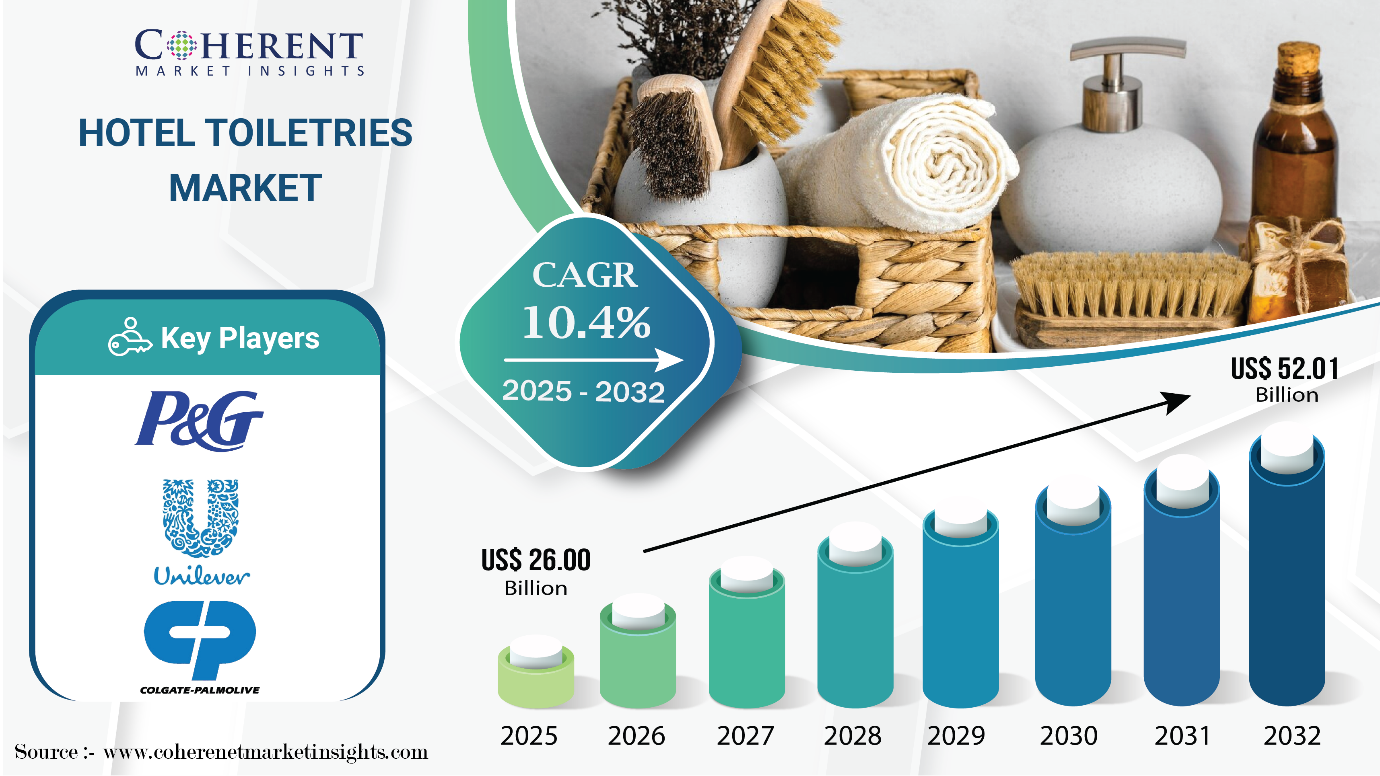 According to Coherent Market Insights (CMI), the global hotel toiletries market size is projected to expand from USD 26 Bn in 2025 to over USD 52 Bn by 2032.