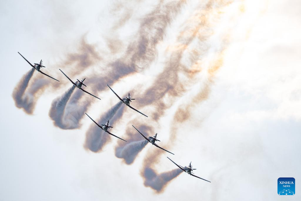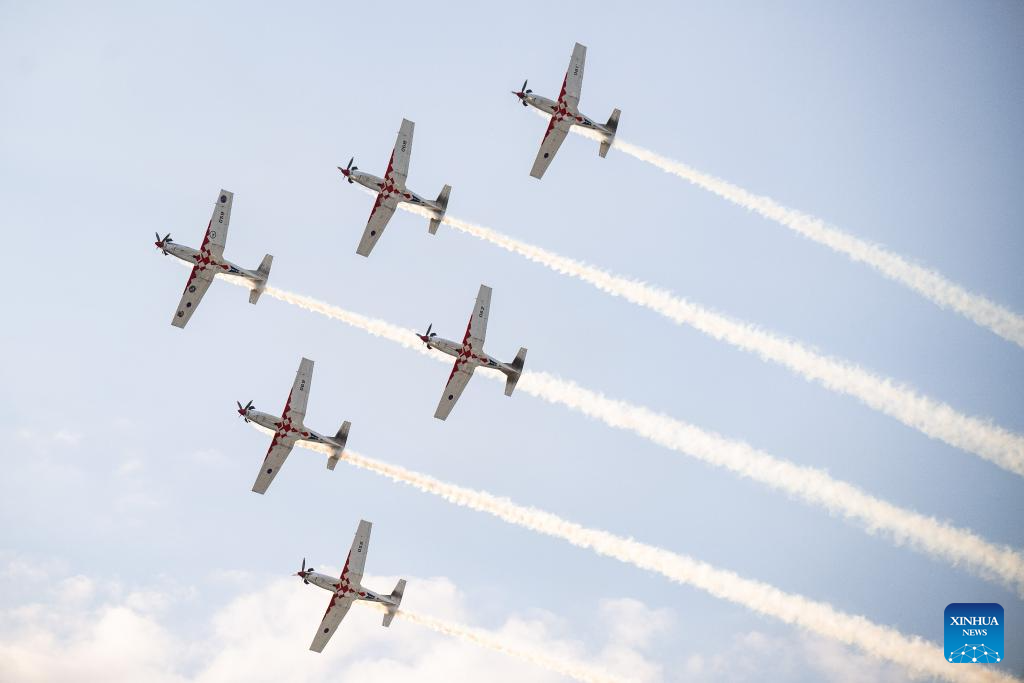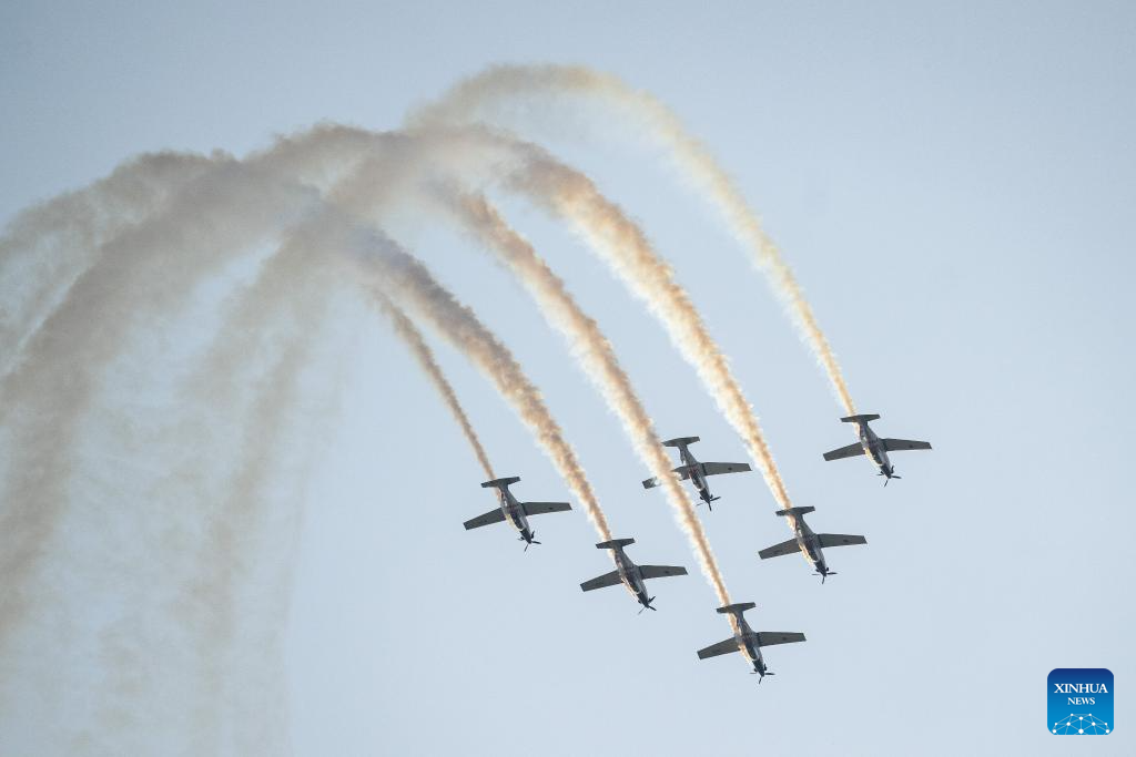 The Croatian Air Force’s aerobatic display team, Wings of Storm, performs during the AIRVG 2025 air show in Velika Gorica, Croatia on May 11, 2025. (Davor Puklavec/PIXSELL via Xinhua)