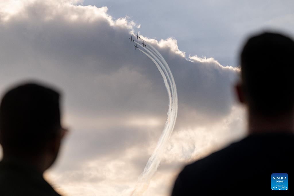 Spectators watch as the Croatian Air Force’s aerobatic display team, Wings of Storm, performs during the AIRVG 2025 air show in Velika Gorica, Croatia on May 11, 2025. (Davor Puklavec/PIXSELL via Xinhua)