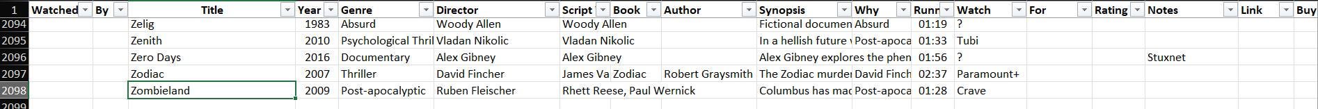 I’m using Microsoft Excel to track movies. I typically use the Wikipedia page for most of the data and Justwatch.com for the synopsis and where it’s streaming if I don’t have the physical media.