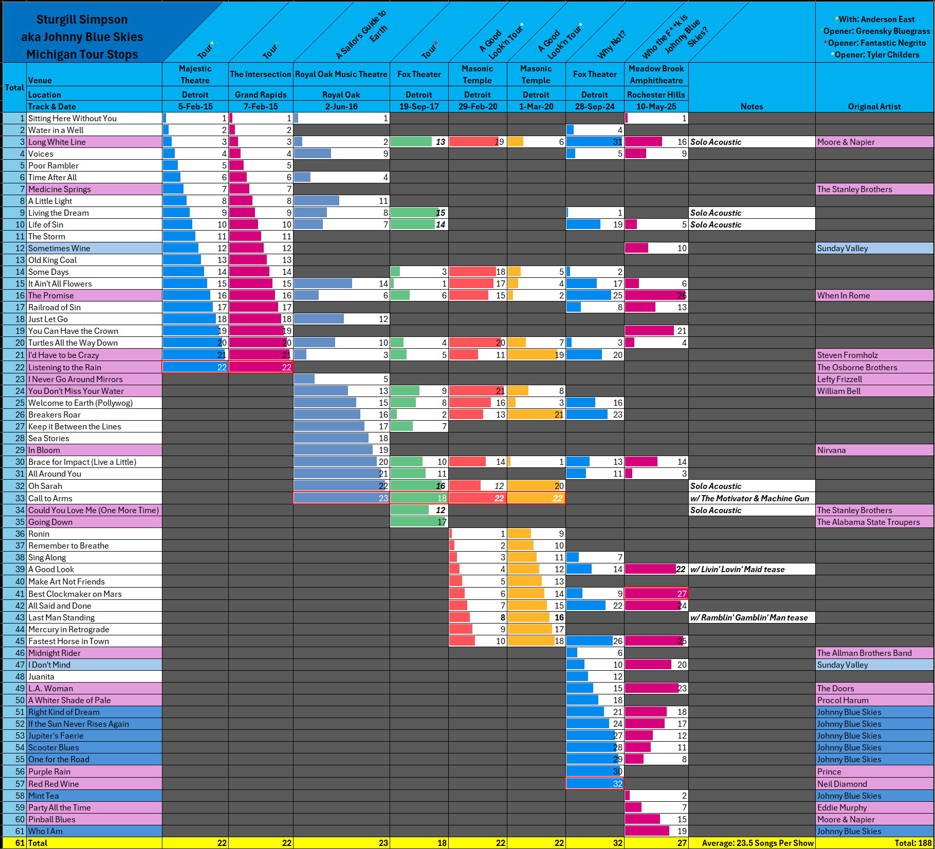 Made a visual representation of my favorite artist Sturgill Simpson's setlists for each of his shows in my home state of Michigan. Personally, I attended my 4th Sturg show on Saturday night. Incredible as always.