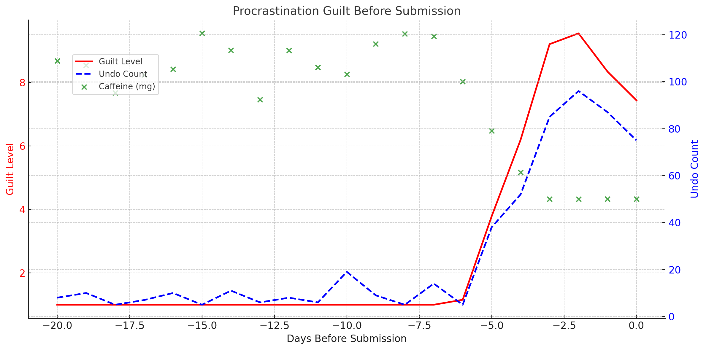 Used a simple 1–10 self-report rating per day. The result was a beautiful, terrifying guilt mountain peaking precisely 48 hours before submission.