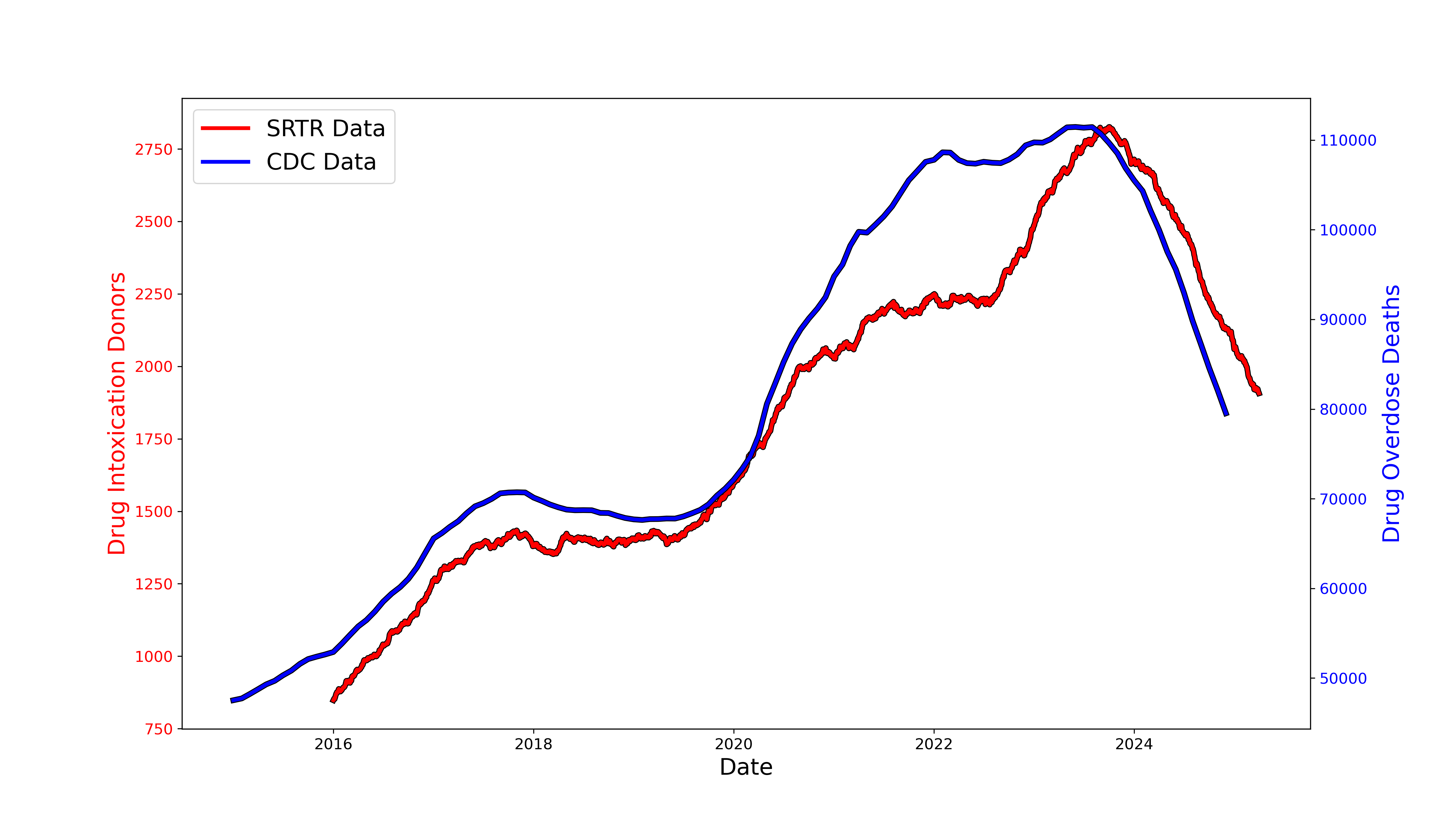 This graph trends the yearly number of people in the United States who died from drug overdose (CDC Data in blue) and the yearly number of deceased organ donors in the United States who died from drug intoxication (Scientific Registry of Transplant Recipients [SRTR] Data in red). CDC data is lagged by at least 4-5 months whereas SRTR data is only lagged by about 1-2 months. These correlate really well, so organ donation data can be used as a leading indicator on trends in drug-related deaths in the United States.