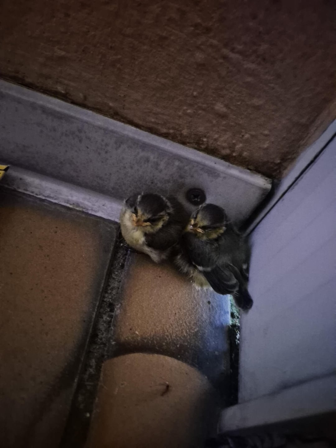 Tagsüber kommt die Mutter oder Vater (kann nicht erkennen wer wer ist) immer alle paar Minuten vorbei und bringt den kleinen essen habe davon sogar ein Video aufgenommen falls nötig. Nachts sind die zwei alleine am kuscheln. Ich habe sie jetzt eben auf dem kalten Balkom boden kuscheln gesehen und dachte mir das das zu kalt wird und haben ihnen (Bild 2) eine box gemacht und den boden mit 100% baumwolle pads ausgepolstert damit es den kleinen nicht zu kalt wird und den deckel der Schachtel zur Hälfte drauf gemacht das sie etwas Schutz von oben haben. Ausserdem ist im gelben behälter etwas Wasser. Essen gebe ich ihnen keines da ich dachte das sei die Aufgabe der Eltern.