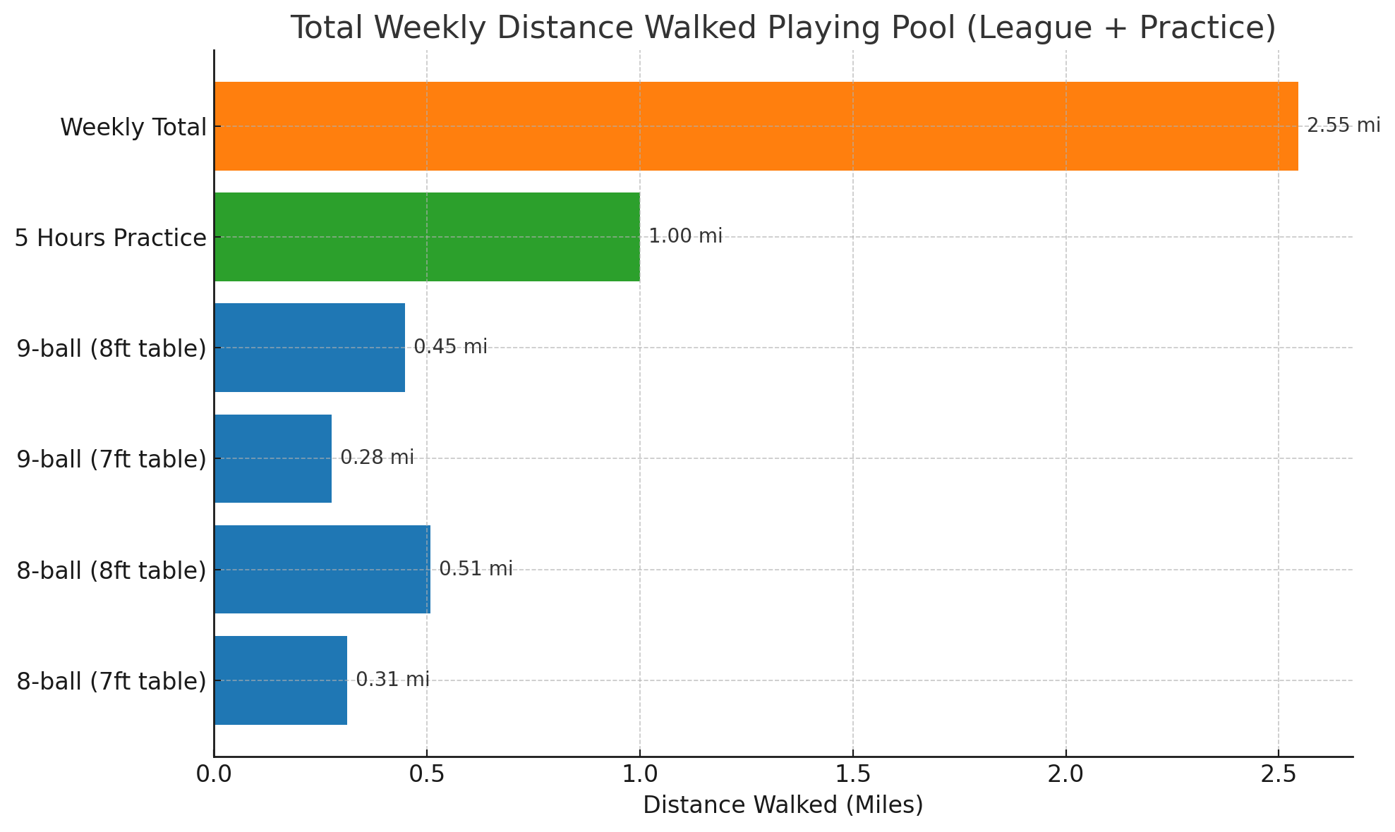 So, in a typical week I'm getting about 1.5 miles of slow sustained exercise. For the 5 hours of practice where I have no downtime, am setting up shots, walking around the table a lot more, breaking multiple times in a row, etc. I'm probably getting another mile in when practicing.