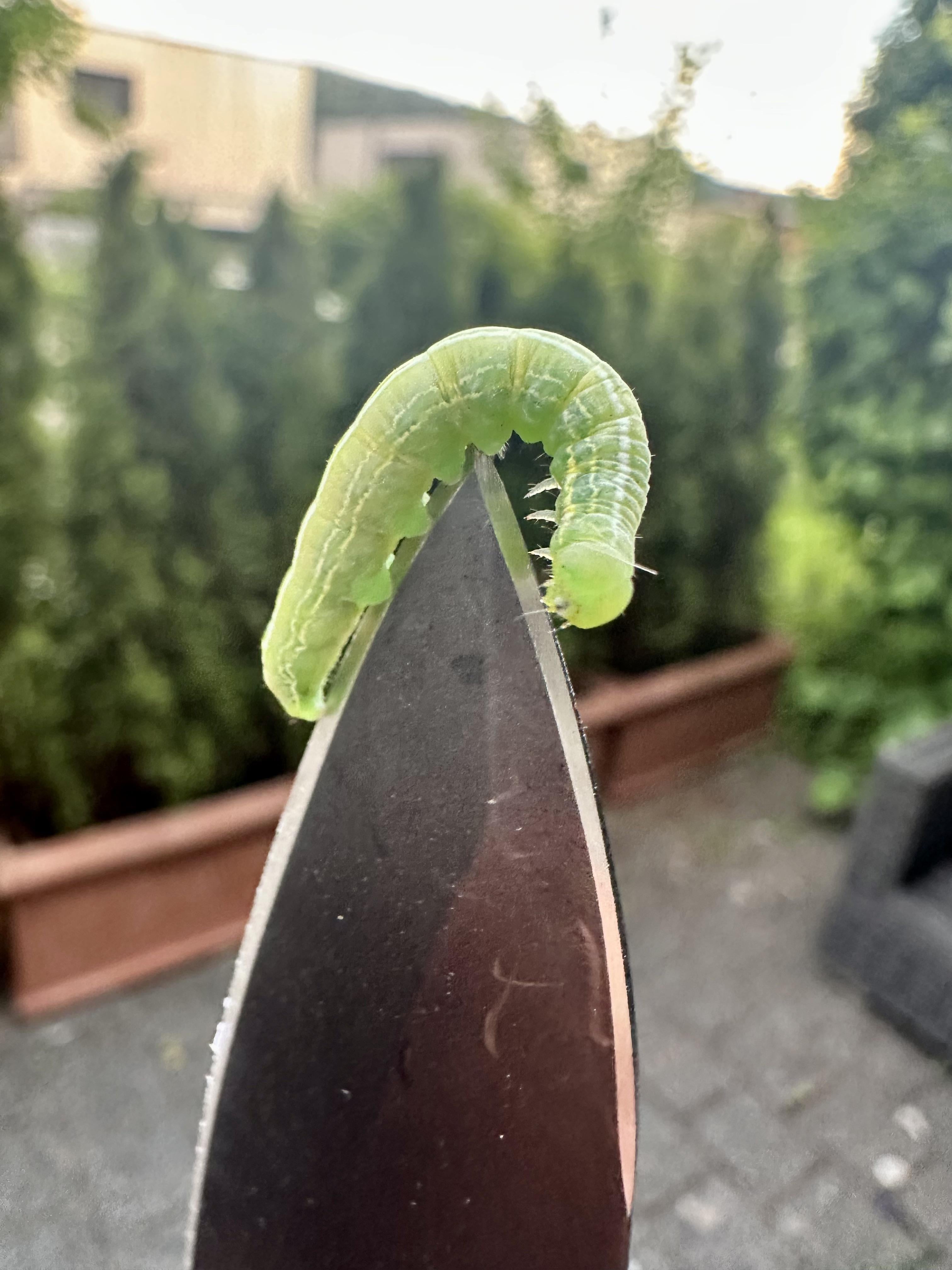Das ist die Raupe vom Kleinen Frostspanner! In diesem Fall eine, die in den Zirkus gehört, so wie sie über die Klinge balanciert.