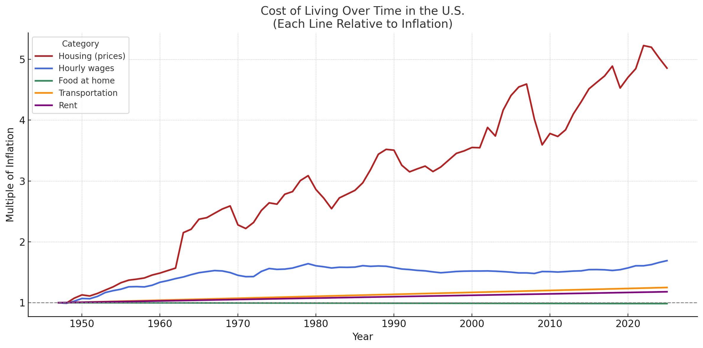 Scaling the Y axis as a multiple of a rate is an interesting decision — clearly the intent is to represent that housing price increase is outpacing inflation as a whole, but the 4 metrics seemingly unmoving may not be very helpful. When the rate of inflation is already ~1200% since 1950, perhaps mapping inflating and the increase of housing prices specifically in reference may be a better pick?