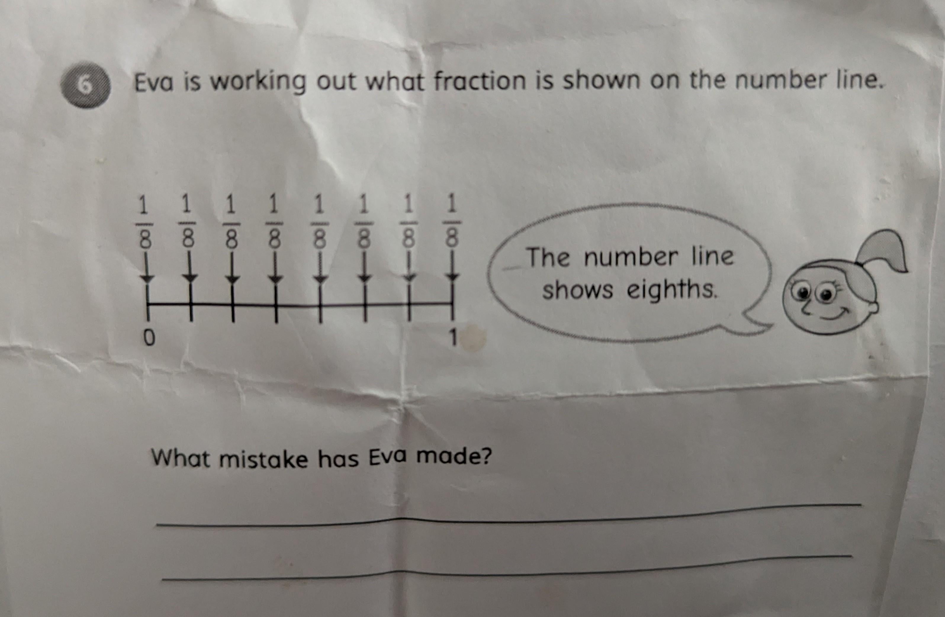11. The number line is divided into seven equal pieces, so each fraction is 1/7, not 1/8. Eva has accidentally labelled 0 as 1/8, so that’s why she’s counted eight of them.
