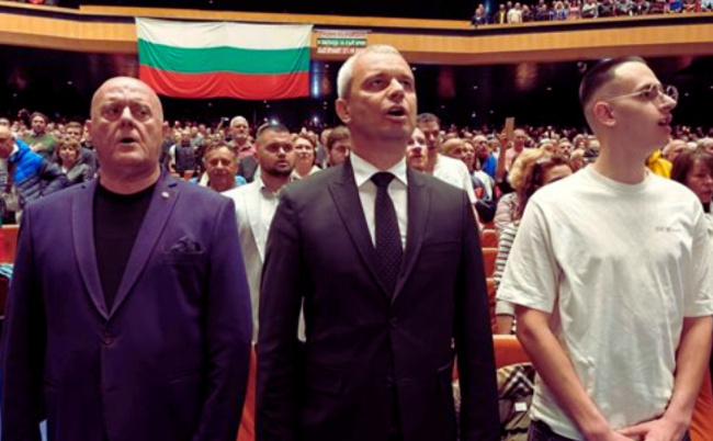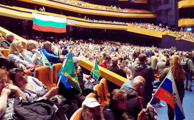 Inside NDK’s Hall 1, the event was presented as a “National Assembly,” with speakers declaring themselves the “true representatives of the people.” Former general Dimitar Shivikov, now a supporter of nationalist-Russophile parties, urged the crowd to resist the euro and join the planned May 31 protest. Russian flags waved alongside Bulgarian ones, and a version of the socialist anthem resonated through the hall.