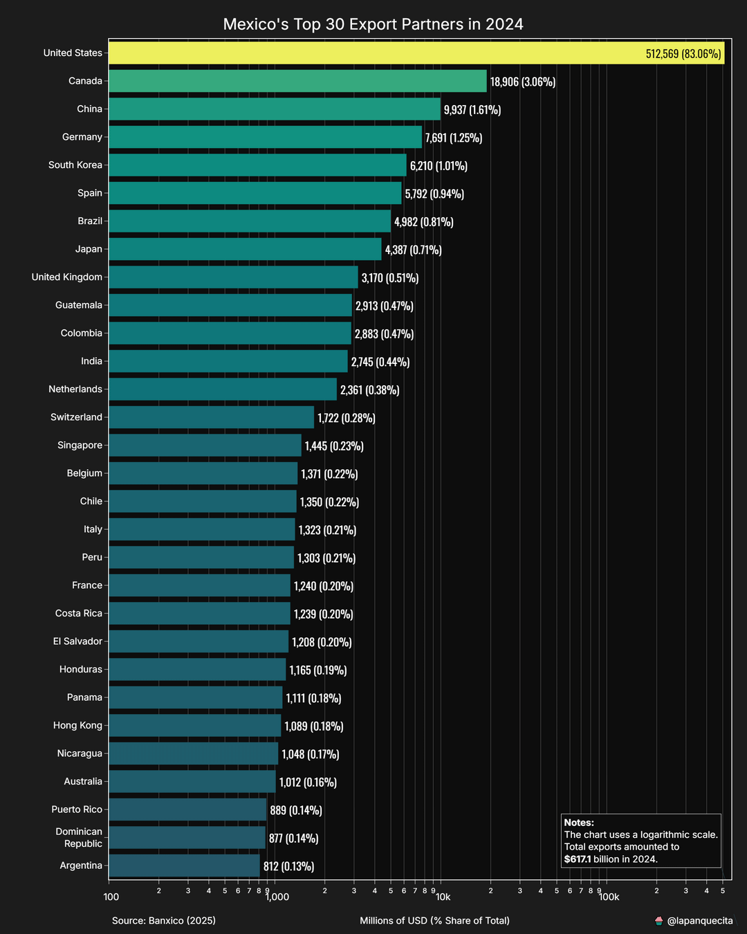 in this post there are 4 images, 2 for exports and 2 for imports, they show how important is the US for Mexico’s foreign trade