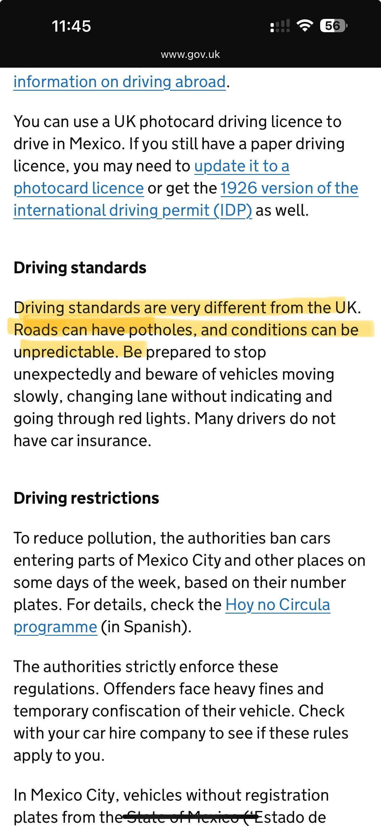 According to the Gov.uk travel advice for Mexico, we don’t have potholes in the UK…