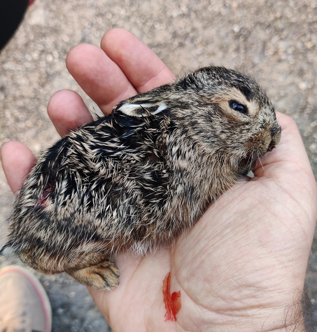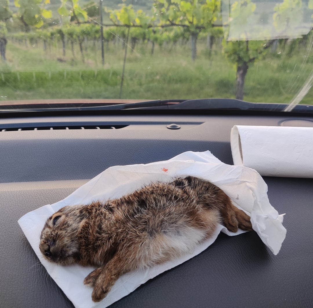 Anyhoo… Wie ich grad wieder Richtung Parkplatz eingebogen bin sind mir erneut zwei (angeleinte) Hunde entgegengekommen. Einer von denen hat offenbar etwas gewittert und ist plötzlich in den hochgewachsenen Grasstreifen zwischen Güterweg und Weinstöcken gehüpft und hat irgendwas geschnappt/ausgegraben. Wie sich herausstellen sollte wars ein Feldhase, und zwar offenbar ein wirklich ziemlich junger. Der Hund hat seine Beute auf Kommando zwar eh schnell wieder ausgelassen und auf den ersten Blick hats auch so gewirkt, als wär dem Häschen nicht viel passiert (kleine Fleischwunde rechts an der Hüfte und leichte Verletzung beim Maul)…