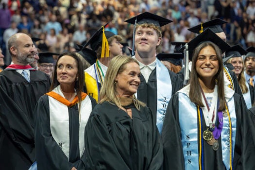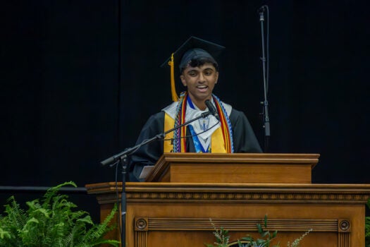 Following a brief welcome from Amanda Esslinger, SPHS’s principal, Rahul Karthik, one of the school’s 27 valedictorians, addressed his classmates. To be deemed a valedictorian, one must compile a cumulative GPA of 4.45 or higher during their high school career.