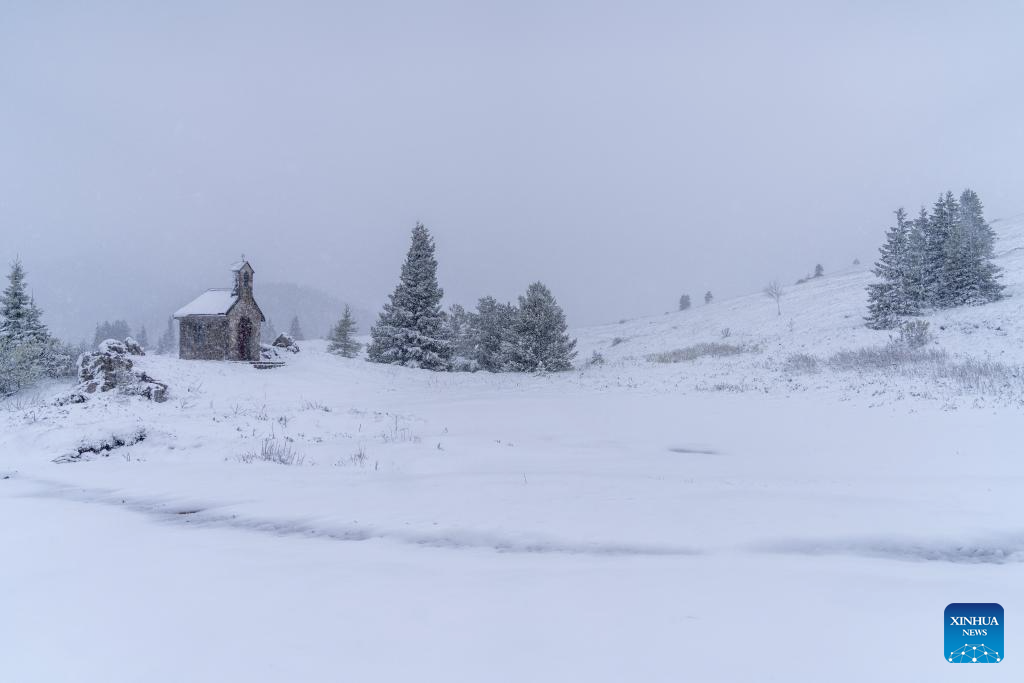 This photo shows a snowfall in the Northern Velebit National Park, Croatia, on May 23, 2025. (Hrvoje Kostelac/PIXSELL via Xinhua)