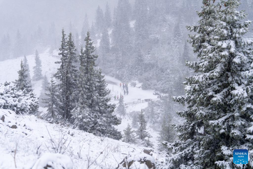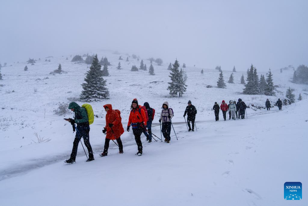 People walk in a snowfall in the Northern Velebit National Park, Croatia, on May 23, 2025. (Hrvoje Kostelac/PIXSELL via Xinhua)