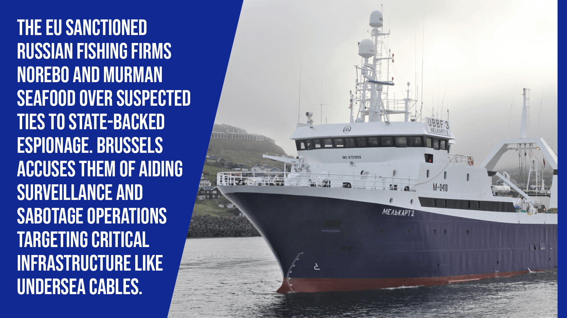 The EU sanctioned Russian fishing firms Norebo and Murman SeaFood over suspected ties to state-backed espionage. Brussels accuses them of aiding surveillance and sabotage operations targeting critical infrastructure like undersea cables.