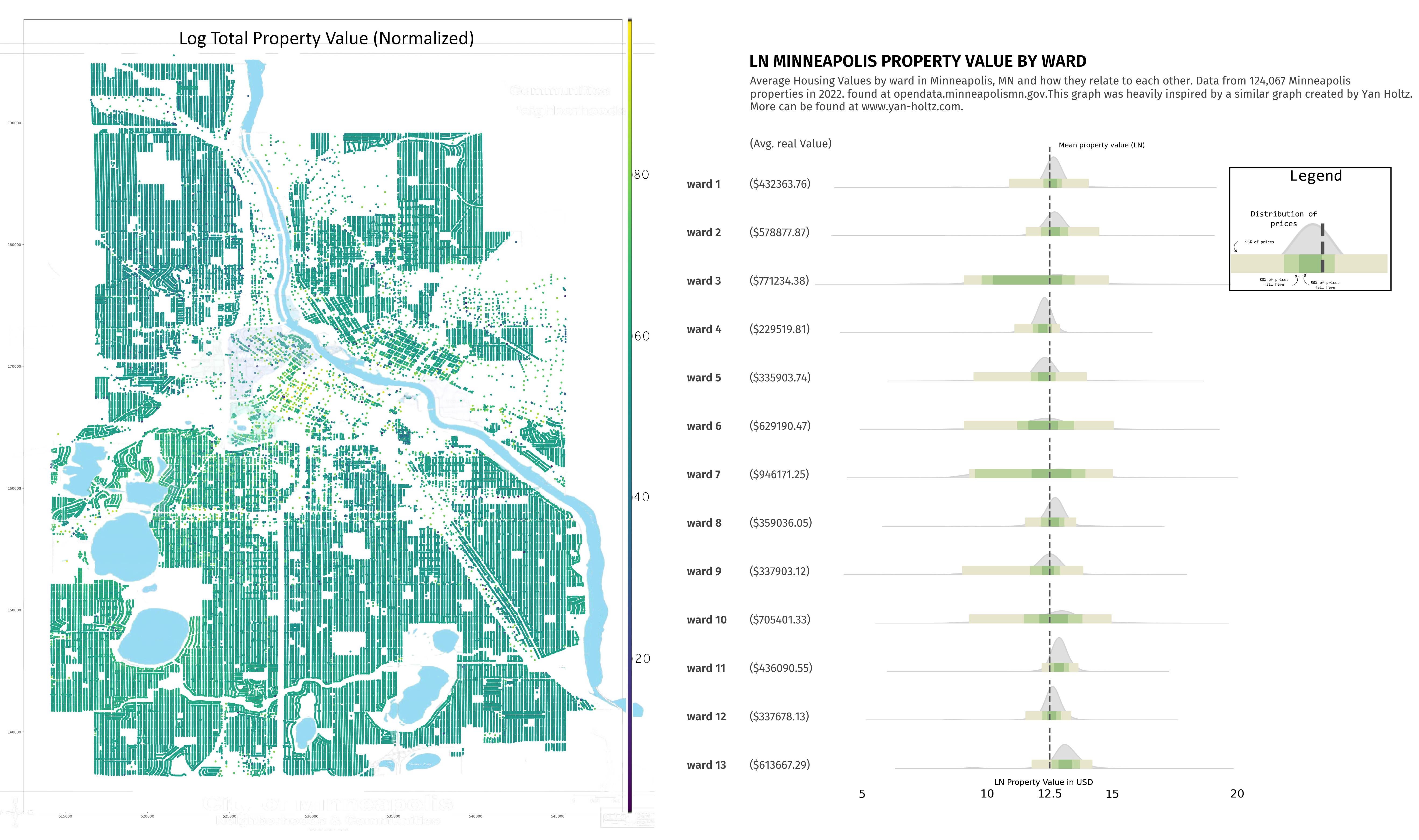 [OC] Every Minneapolis property graphed by Ln Property Value + Ward Data