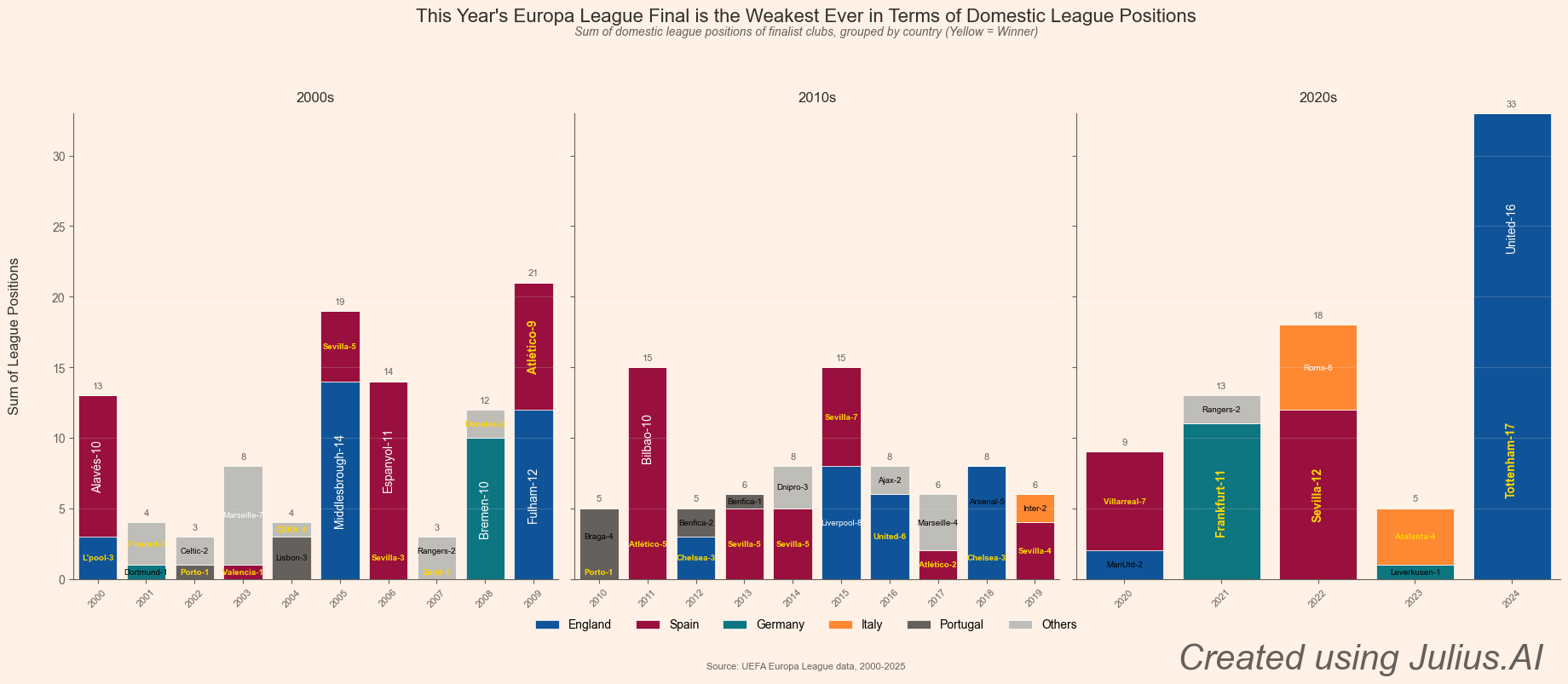 [OC] The 2024-25 Europa League final featured the weakest teams – by domestic league position in the competition’s history.[OC]