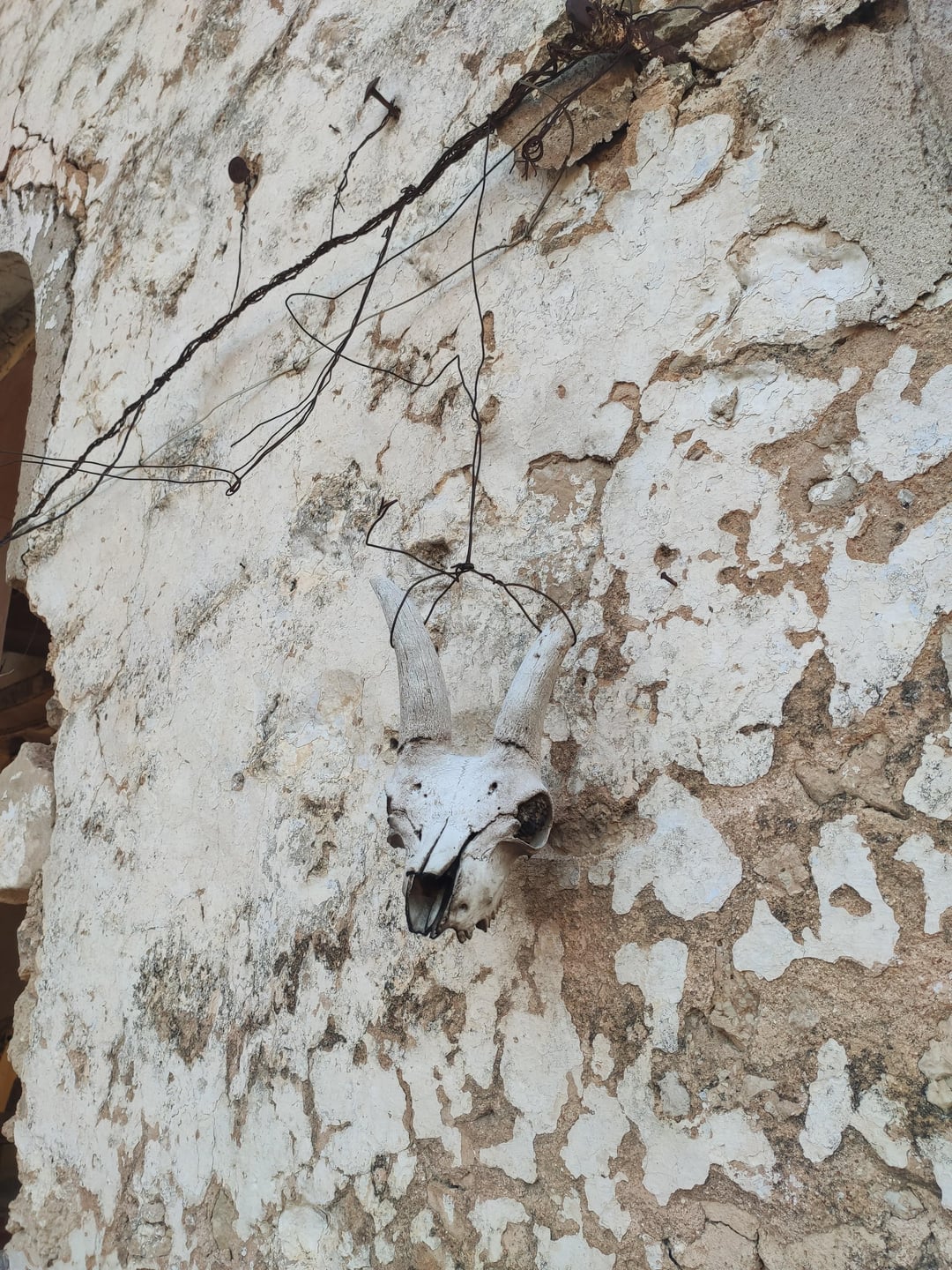 No, y si fuera costumbre sería sobre el marco de la puerta, habría un elemento más permanente para colocarlo que unos cables mal colgados. Lo que sí era costumbre en ciertos momentos fue enterrar a los perros bajo el umbral de la puerta para protegerla o un animal entero dentro de la casa (enterrado) como sacrificio antes de construirla