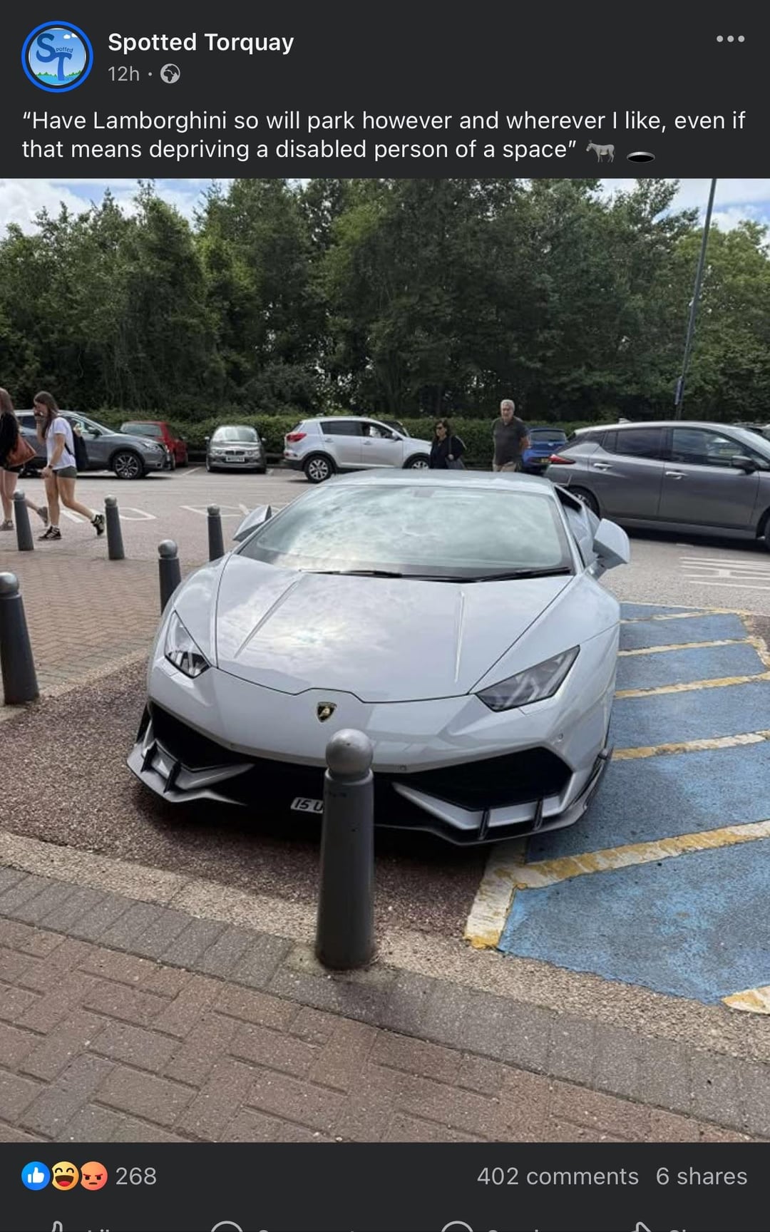 20. “A Lamborghini in a disabled space!? Outrageous! I’d like to see the owner justify this! They’re not going to have a leg to stand on….”
