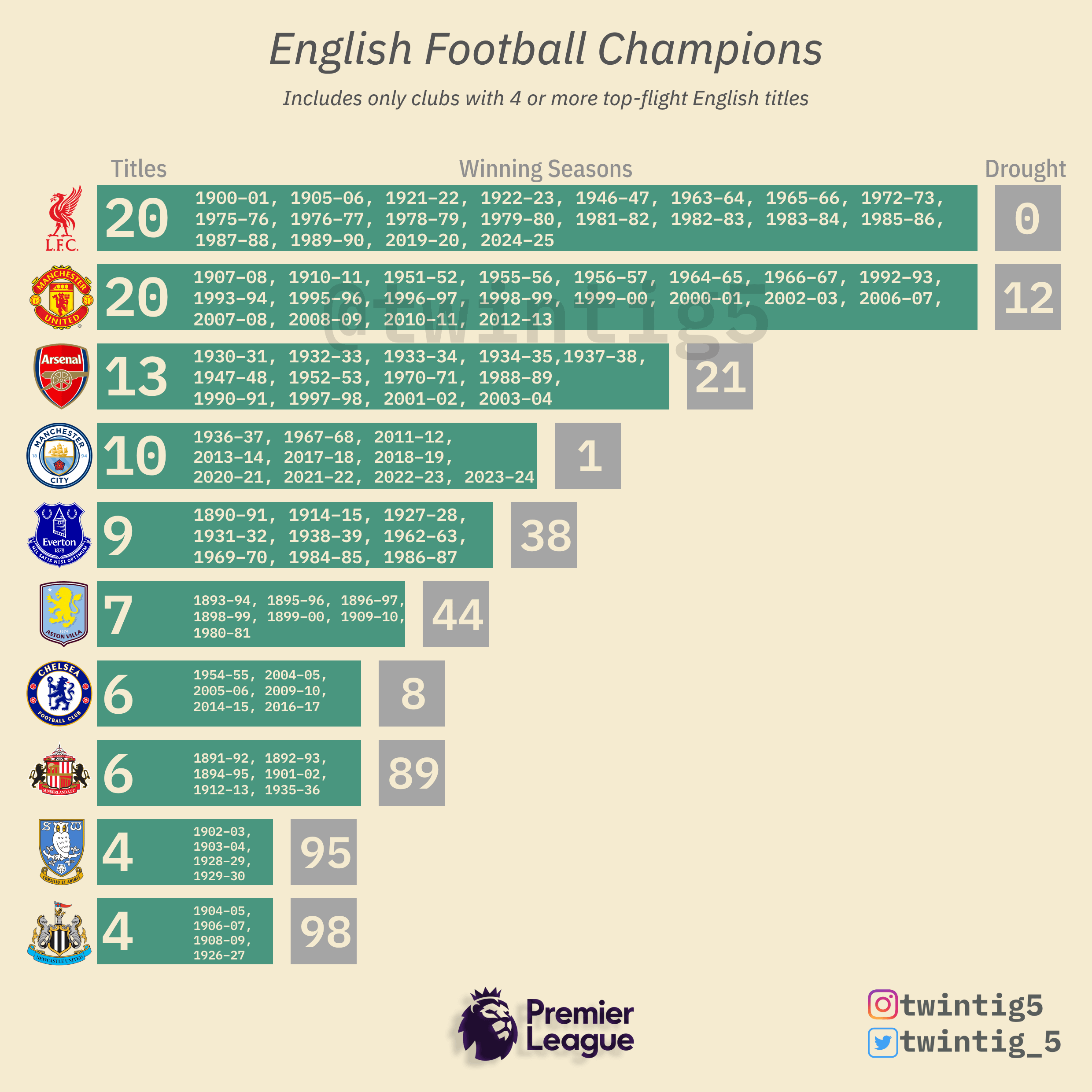 I feel like you could tidy up the ‘year’ section a bit by only including the year they won it (i.e. Liverpool recently won it in ’25), rather than having to put two years for each win. Might make the graphic a bit cleaner?