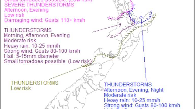 MetService also said there is a moderate risk of thunderstorms for Taranaki, northern Taumarunui, Taupō, and the Bay of Plenty northwards.