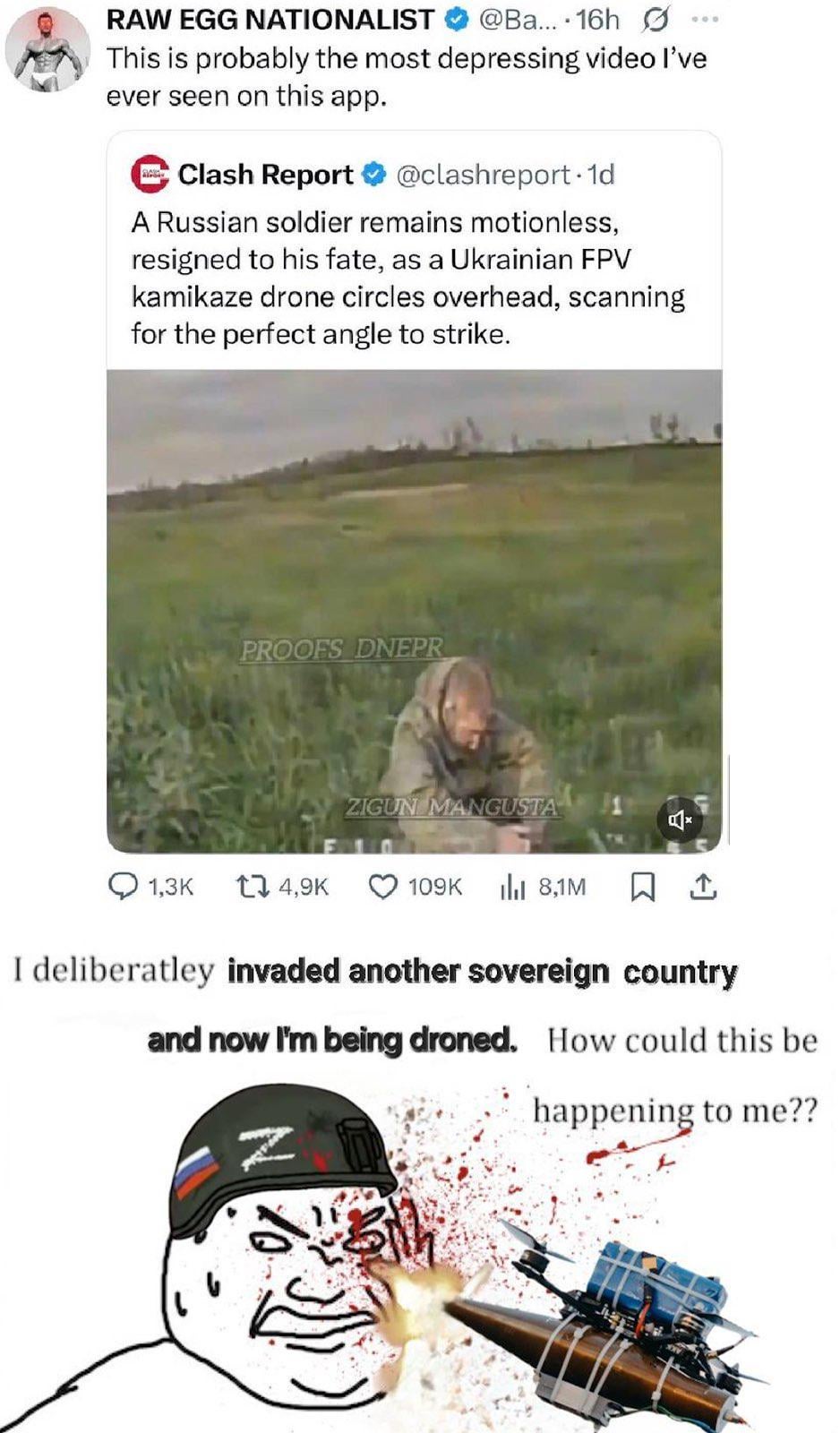 We have a solider who likely signed up because of the money to go kill and steal Ukrainian land. All while Russia still is sending hundreds of their drones into apartment blocks. Either their weapons suck horribly and miss targets by miles which they claim they don’t and are the best in the world or they just send them blindly into cities, or intentionally are targeting civilians.