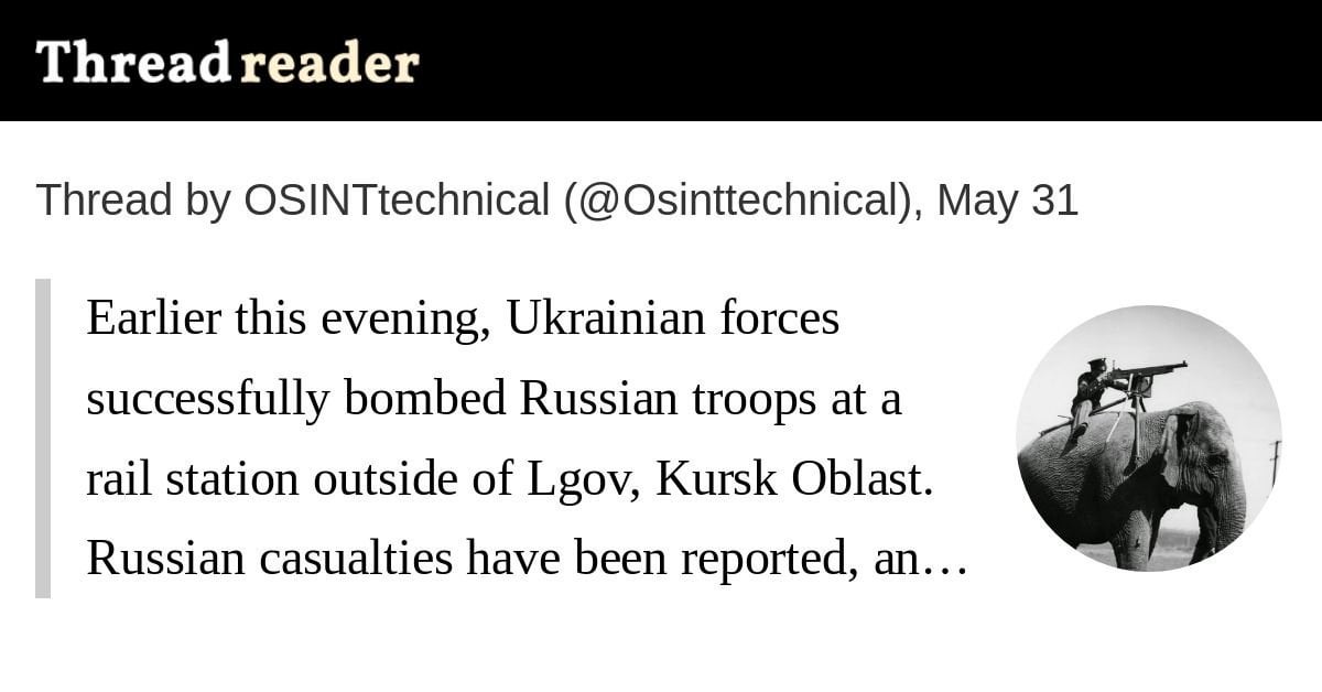 Earlier this evening, Ukrainian forces successfully bombed Russian troops at a rail station outside of Lgov, Kursk Oblast. Russian casualties have been reported, and the area is ablaze.