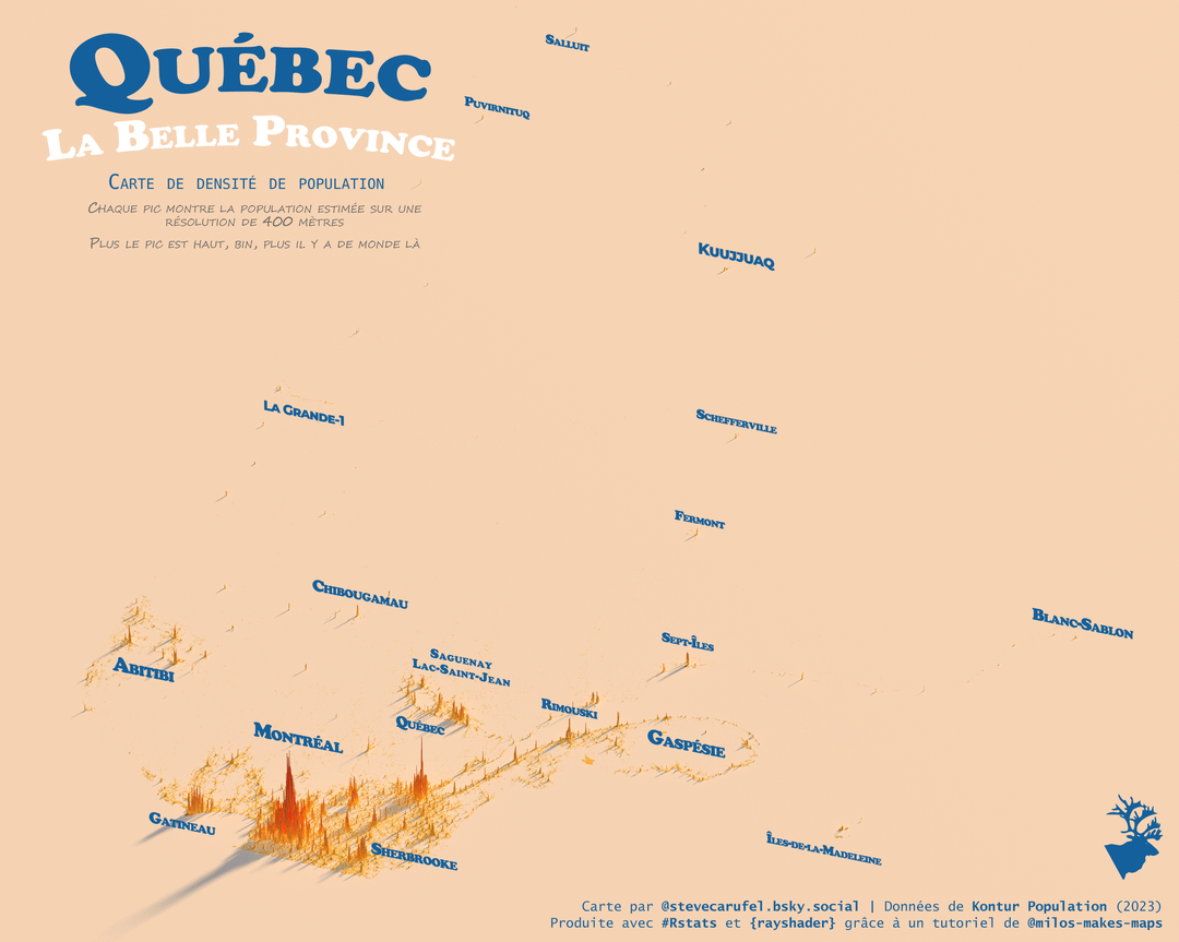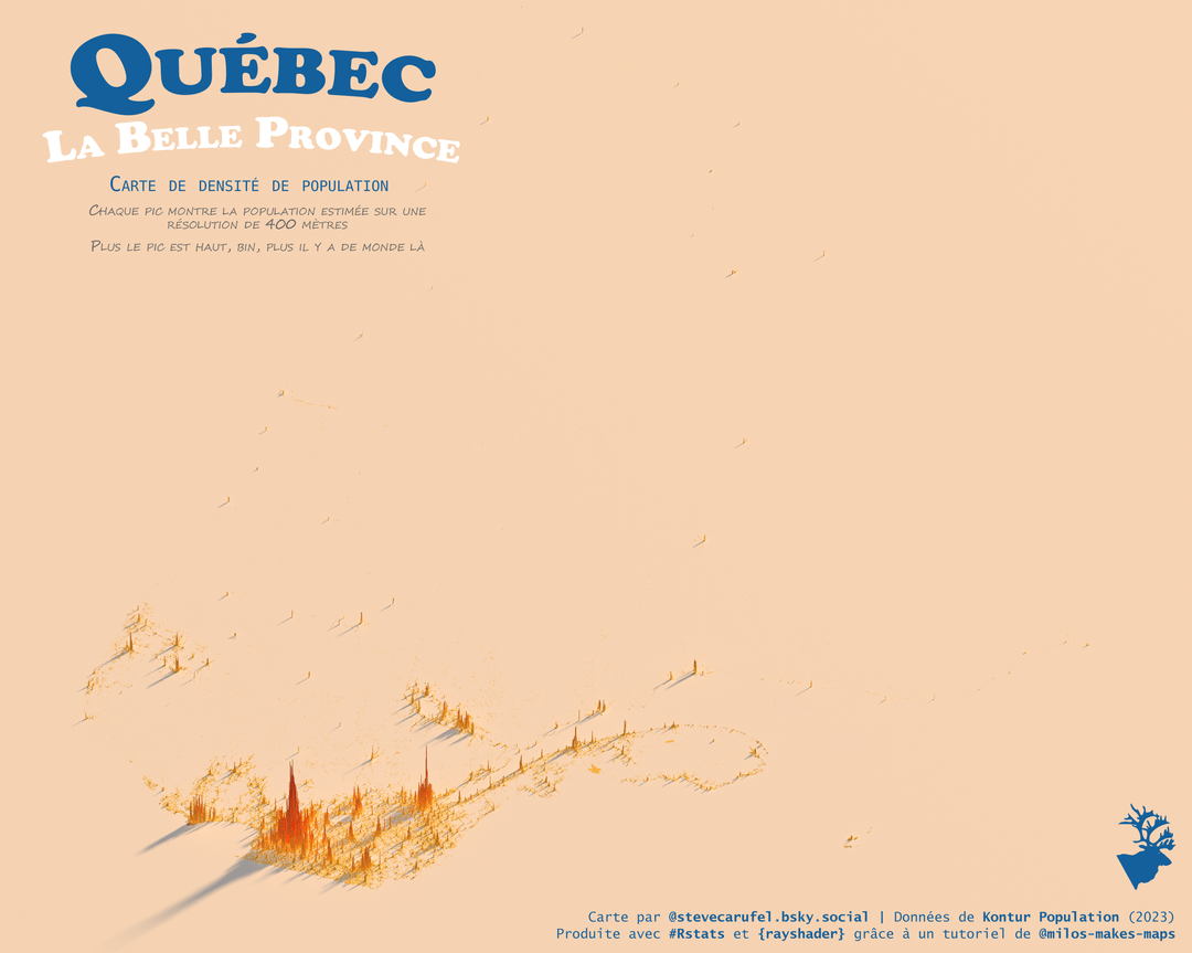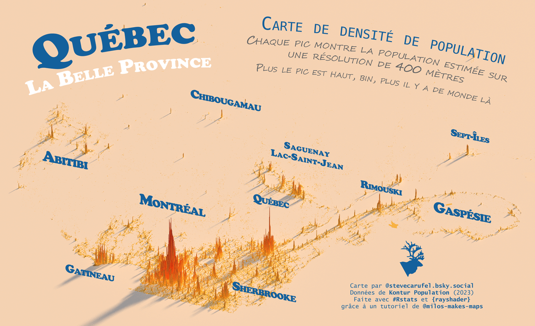 Made with R and {rayshader} thanks to a tutorial by milos-makes-maps : [https://www.youtube.com/watch?v=qTDf5VVnjMM&pp=ygUYbWlsb3MgbWFwcyBzcGlrZSBkZW5zaXR5](https://www.youtube.com/watch?v=qTDf5VVnjMM&pp=ygUYbWlsb3MgbWFwcyBzcGlrZSBkZW5zaXR5) Data is from Kontur Population (2023), an estimate based on multiple sources from satellites and websites : [https://data.humdata.org/dataset/kontur-population-canada](https://data.humdata.org/dataset/kontur-population-canada) Github repo and code [https://github.com/datacarvel/quebec3dpop](https://github.com/datacarvel/quebec3dpop)