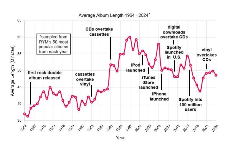 As the visualization says, I averaged the lengths of the 50 most popular (i.e. most frequently logged, not most highly rated) albums for each year on RateYourMusic. I removed two extreme outliers (Natural Snow Buildings by Daughter of Darkness [7:20:00] and Glitch Princess by yeule [5:27:18]) but otherwise let the data speak for itself.