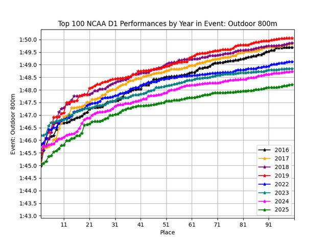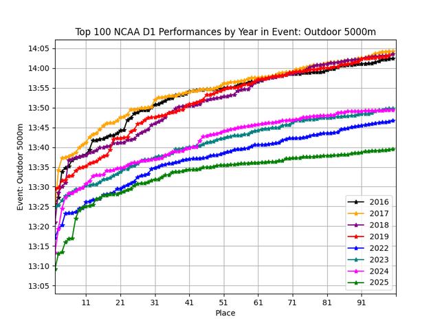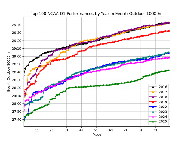 This aligns with the numbers I’ve seen across the broad and anecdotally. There has undoubtedly been a huge progression with supershoes and superspikes for distance running in the past decade. I’m a dated collegiate miler, so full disclosure: that gives me some bias. It’s easy to look at the times guys are running now and feel like they’ve got a huge edge — but the reality is, we had our own advantages over the generation before us too.