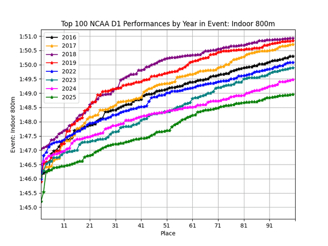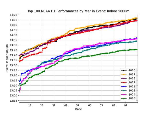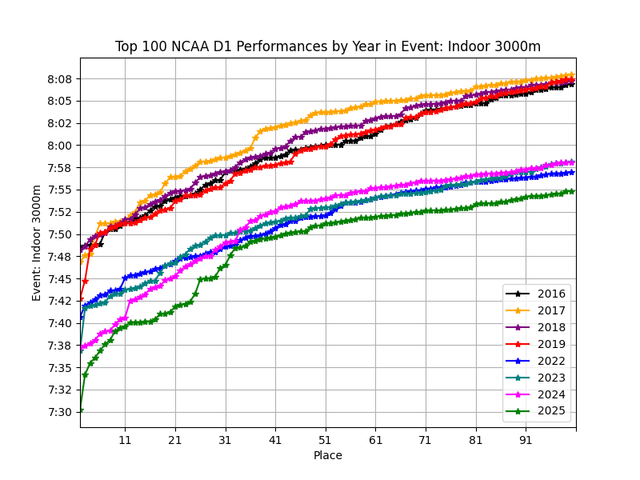 To back that up, here are the numbers I pulled for NCAA D1 sub-4 milers indoors, along with the 100th best mile time in each season: