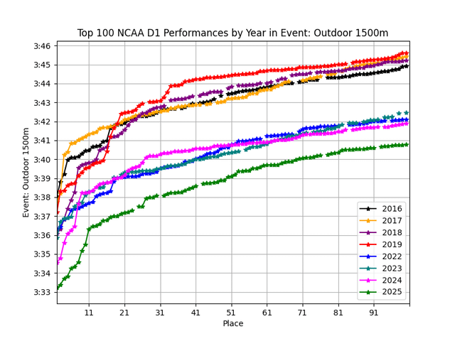 From 2011 to 2025, the *100th-best mile* has dropped nearly **7 seconds**, and most of that drop came after 2020 — when superspikes became widely adopted. The number of athletes running sub-4 at the NCAA has more than tripled. That kind of shift doesn’t happen from training alone. It’s the shoes.