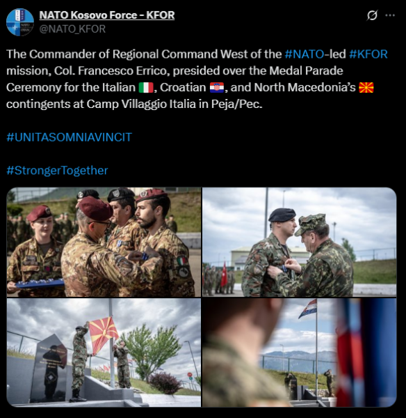 KFOR has announced that the Commander of the Regional Command West, Colonel Francesco Errico, led the medal award ceremony for contingents from Italy, Croatia and North Macedonia,